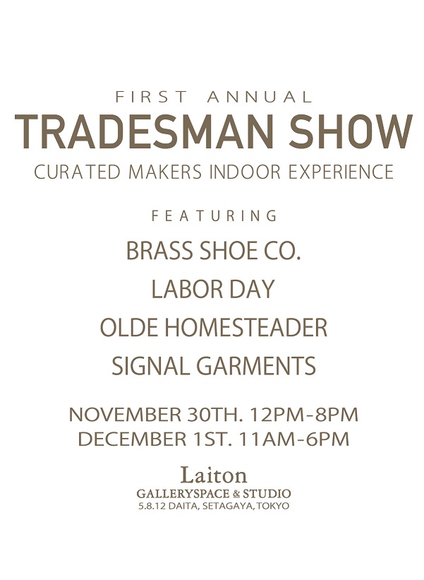 今回のイベント参加はBRASS SHOE Co.・LABOR DAY・OLDE HOMESTEADER・SIGNAL GARMENTSとなり、それぞれの拘りあるプロダクツ・ビンテージ・アンティーク・このイベントで初お目見えするアイテムなどをご用意して楽しい2日間を皆様と過ごしたいと思います。