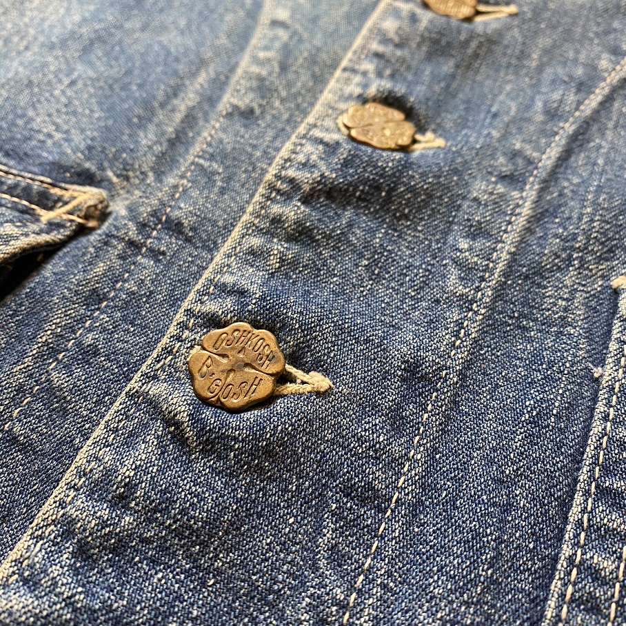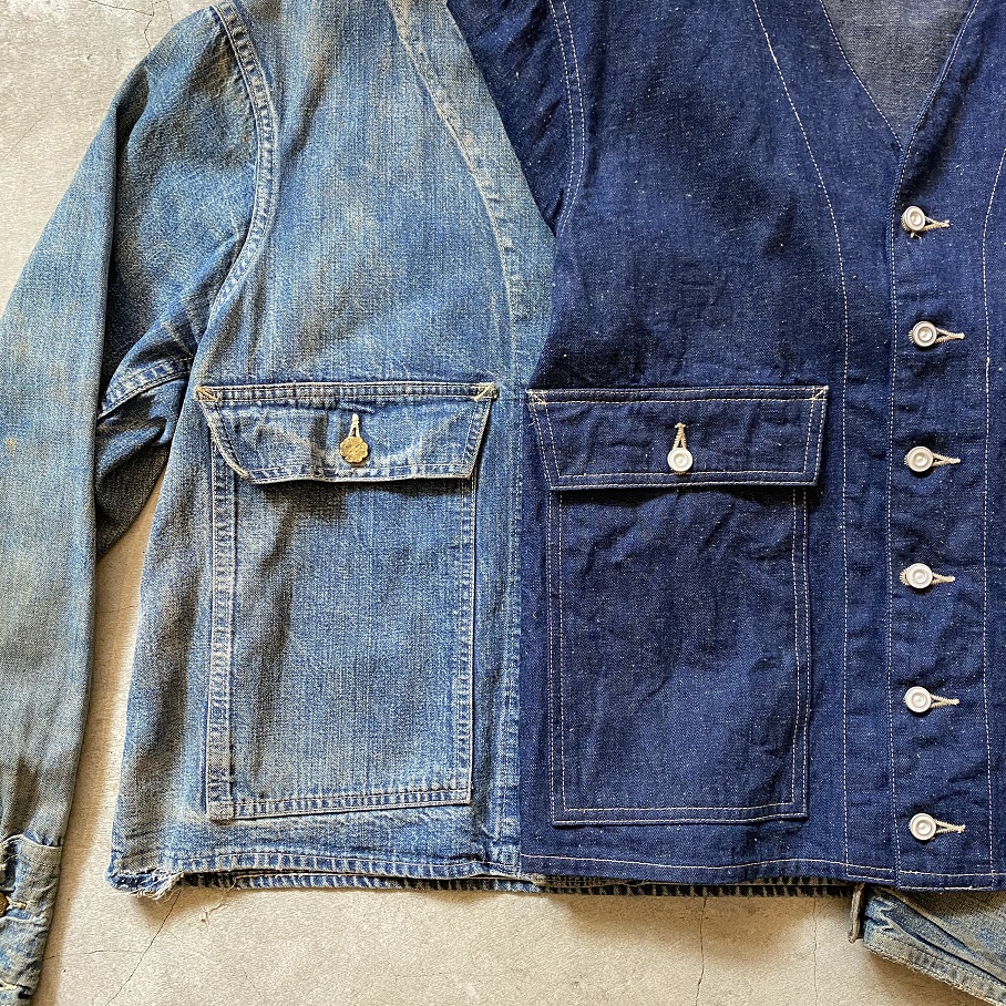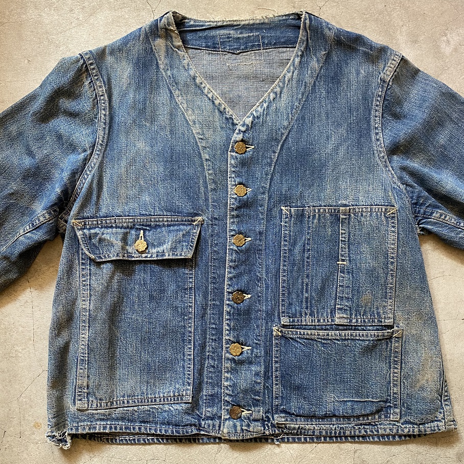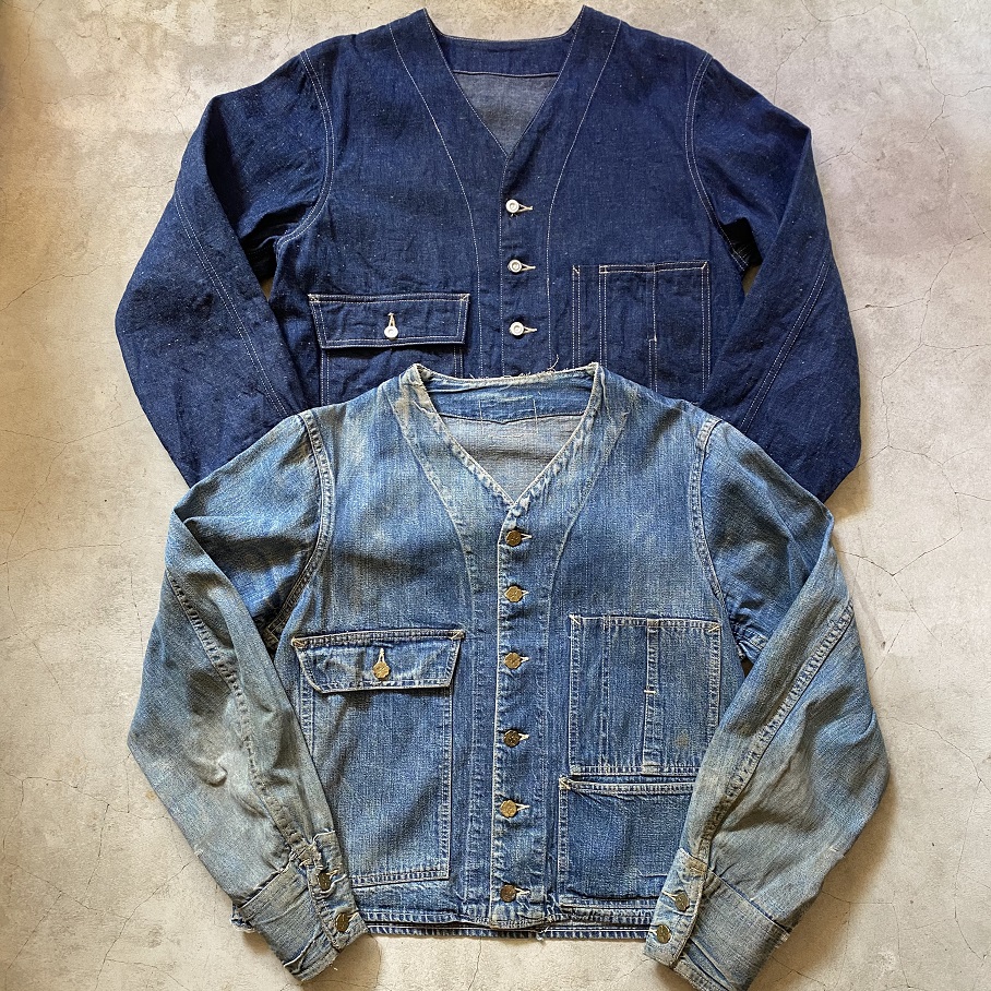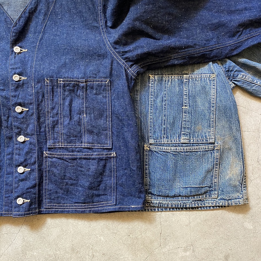 オリジナルビンテージはでは背面を見るとよくわかりますがこのジャケットの上からオーバーオールパンツを穿いていたことが推測できます。