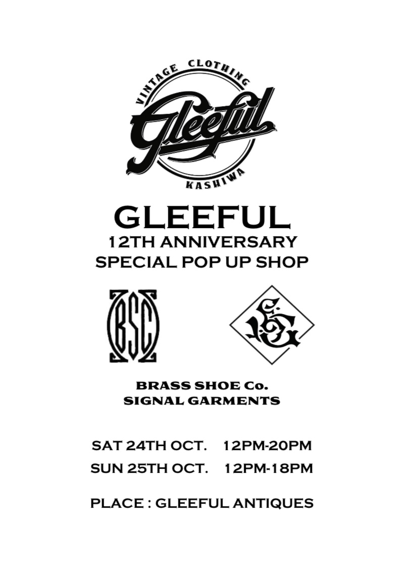 開業から12周年を迎える千葉県は柏市の古着ムーブメントを牽引し続けるショップ”Gleeful”(グリーフル)さんにて来週の10月24日(土)・10月25日(日)の二日間、Gleeful Antiques・BRASS SHOE Co.・SIGNAL GARMENTSの3社合同のポップアップショップを開催いたします。
