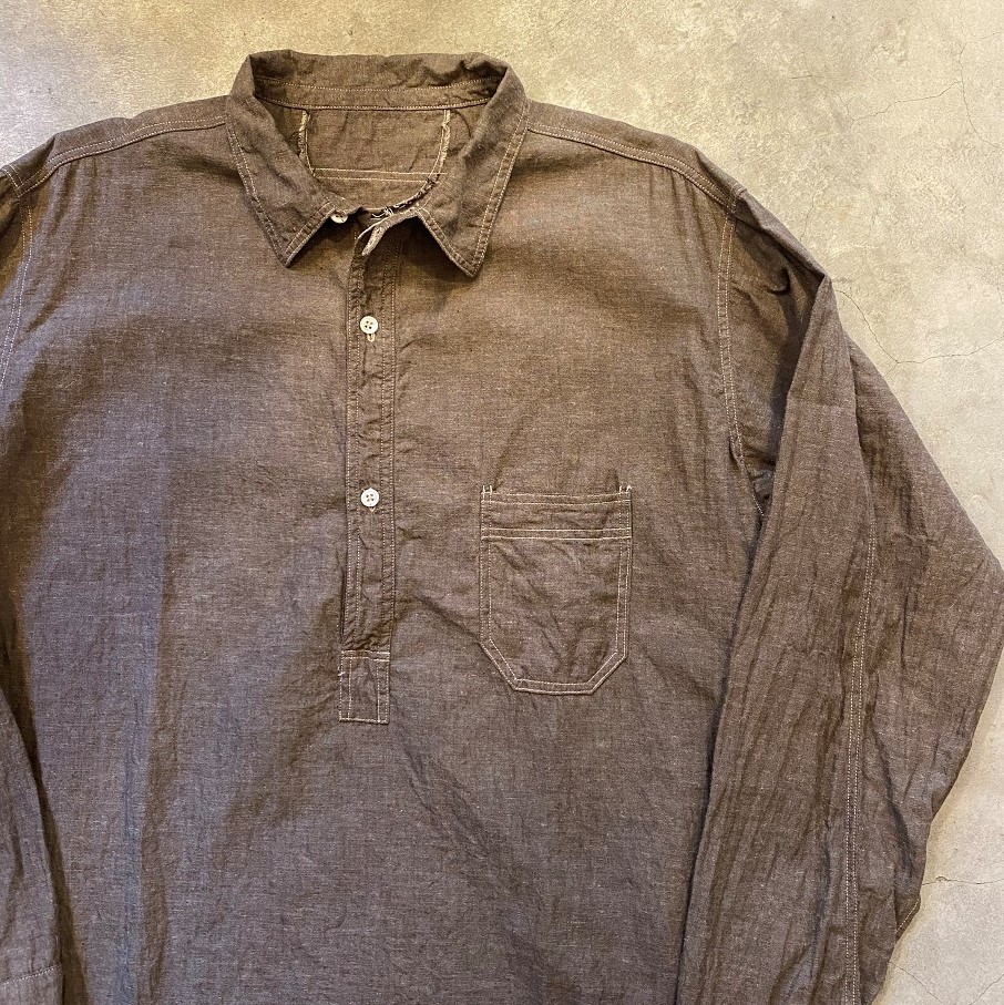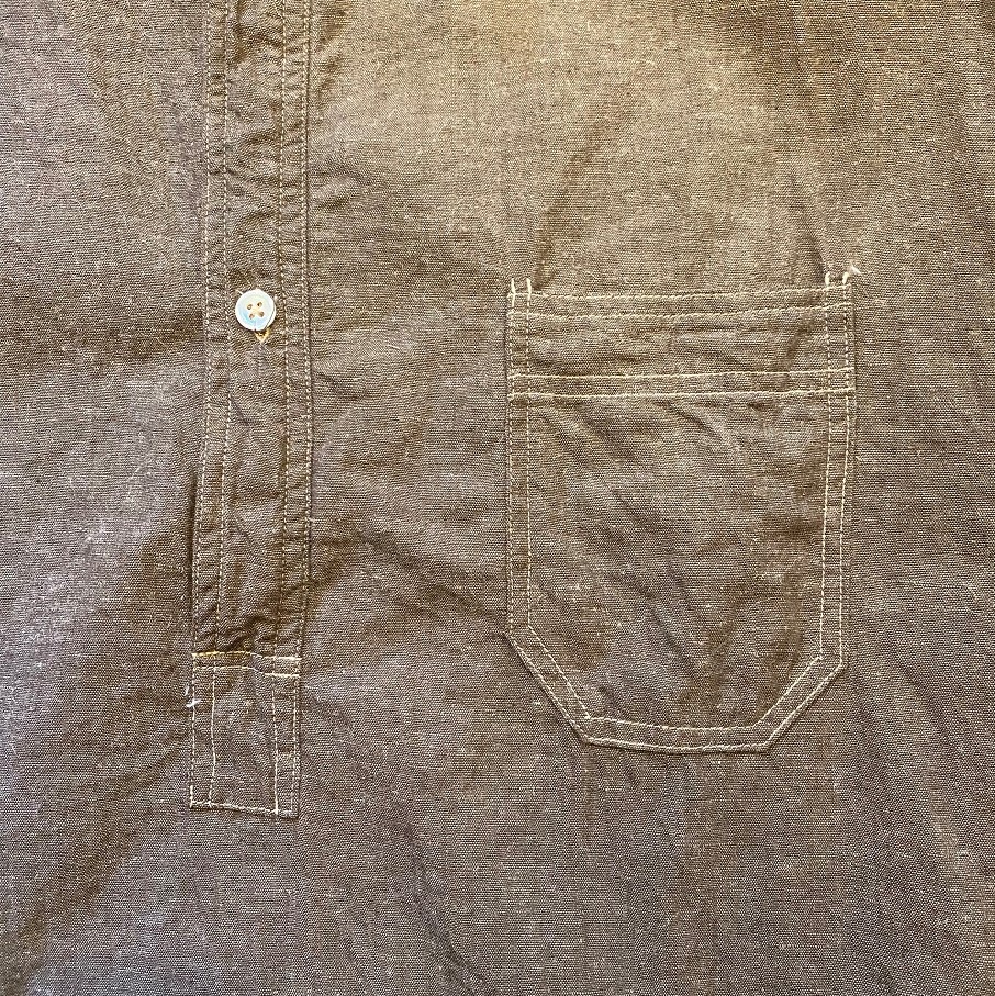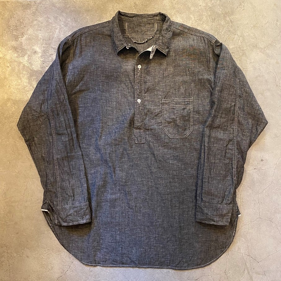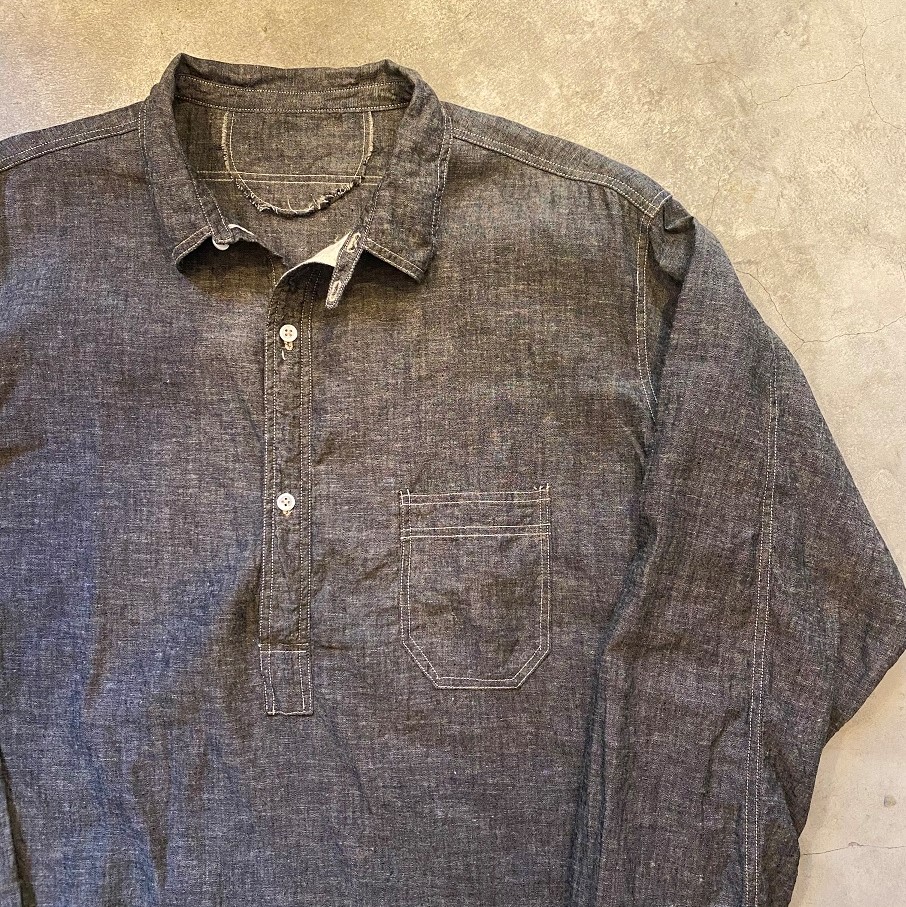 以前GLEEFULさんのイベント時にも大変ご好評いただきましたチンストラップ付のプルオーバーシャツであります”TRIKE SHIRTS”をプレーンなビンテージシャンブレー生地で製作しました。