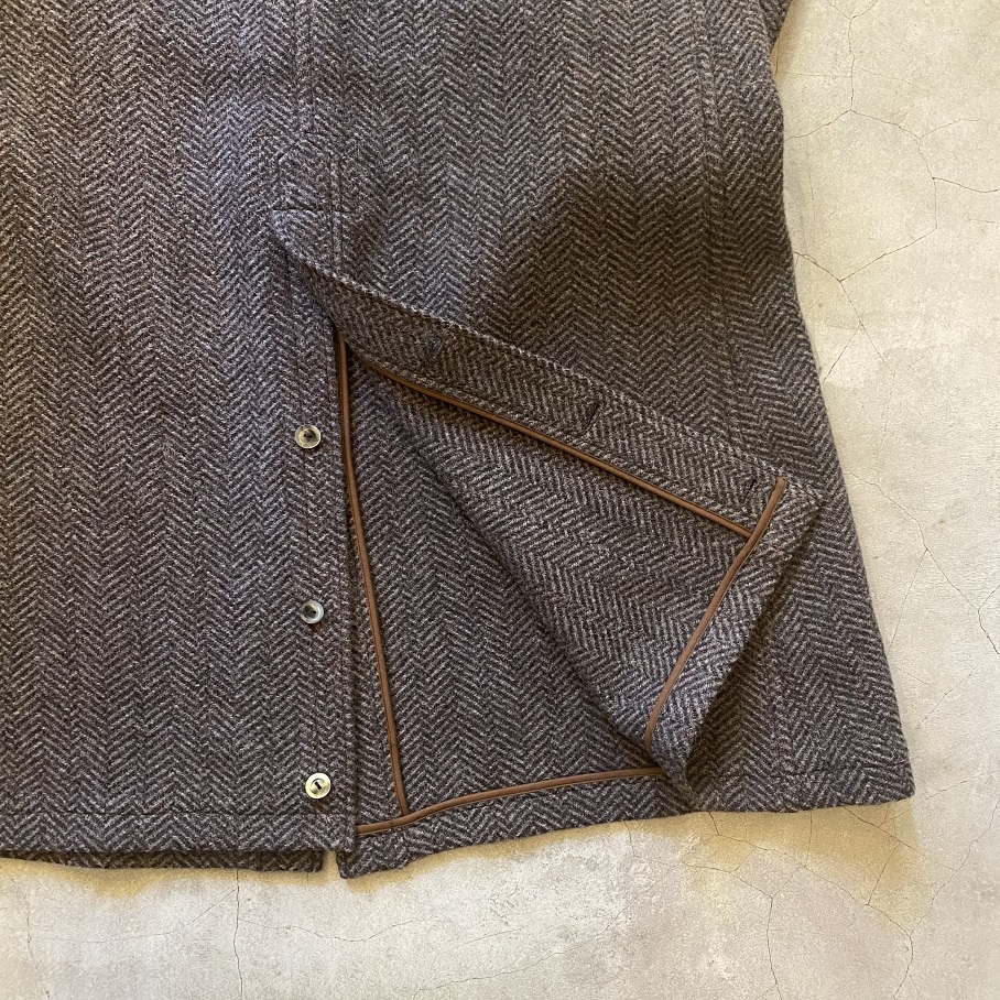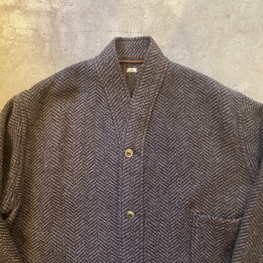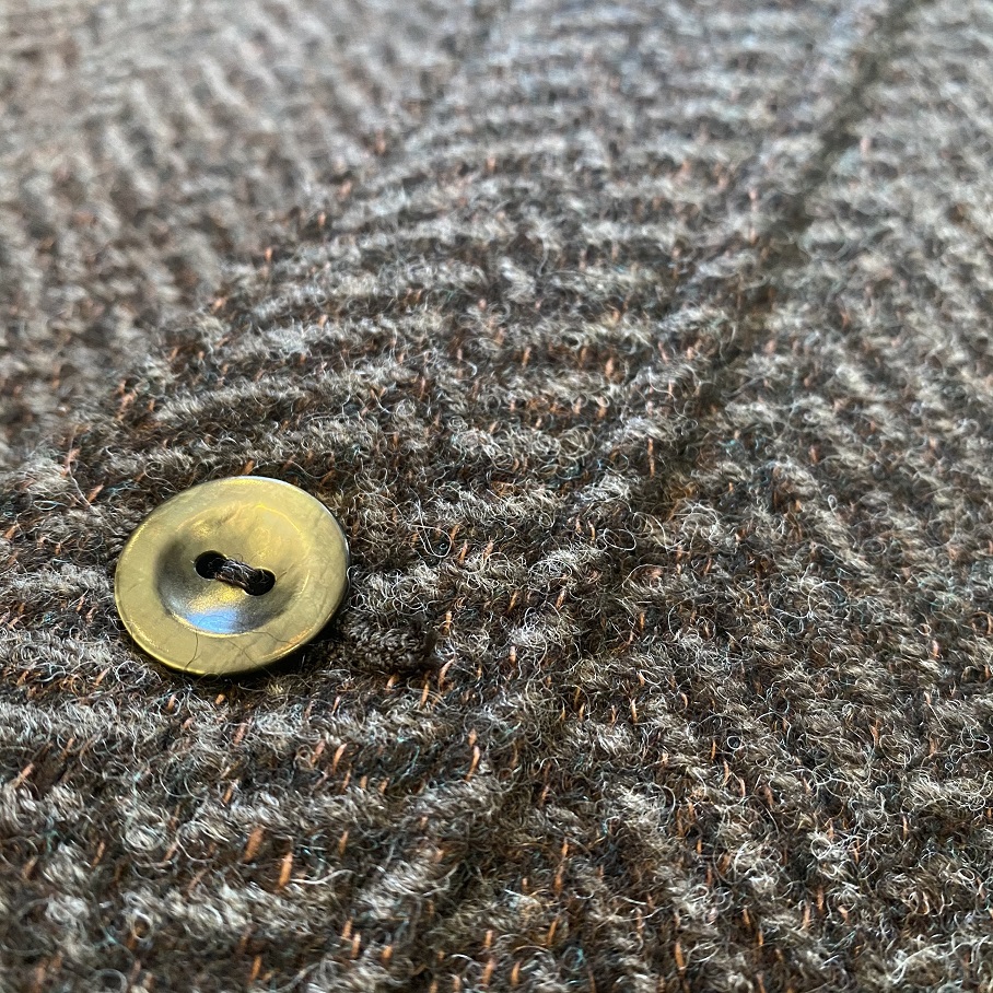 ボタンには黒蝶貝のボタンが贅沢に使用され、生地も非常に大きな模様のヘリンボーン模様で織り上げられております。