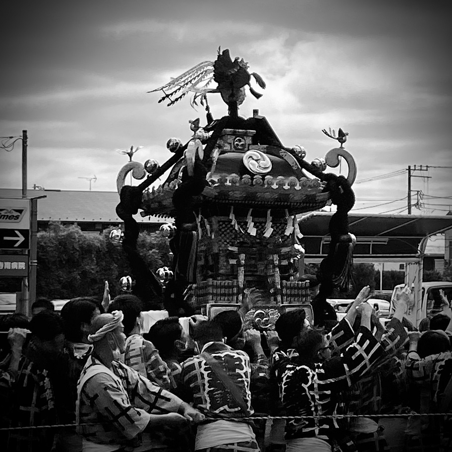 写真は店舗前にて。迫力のある御神輿でした。