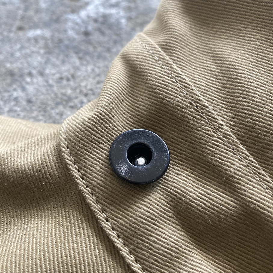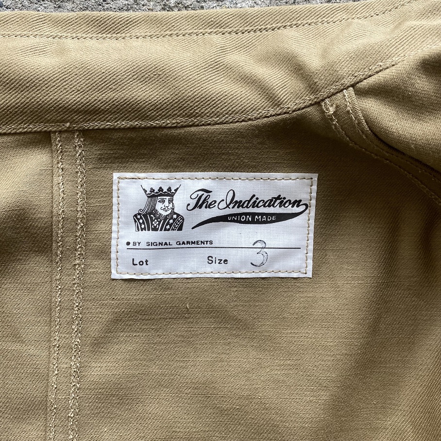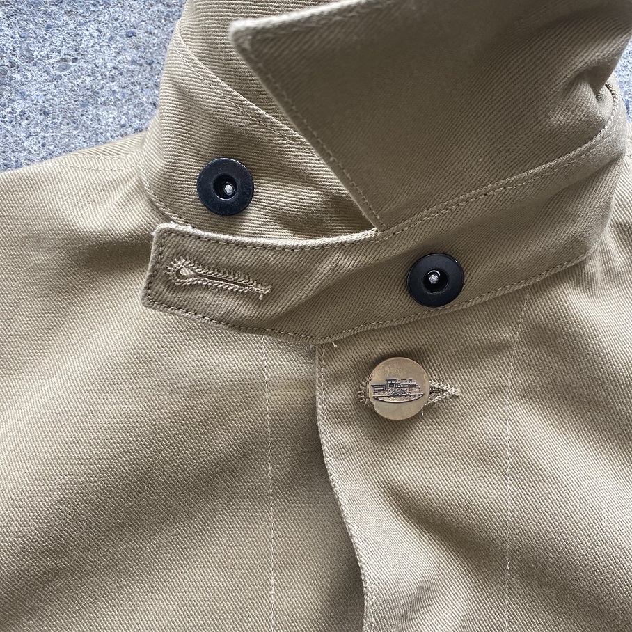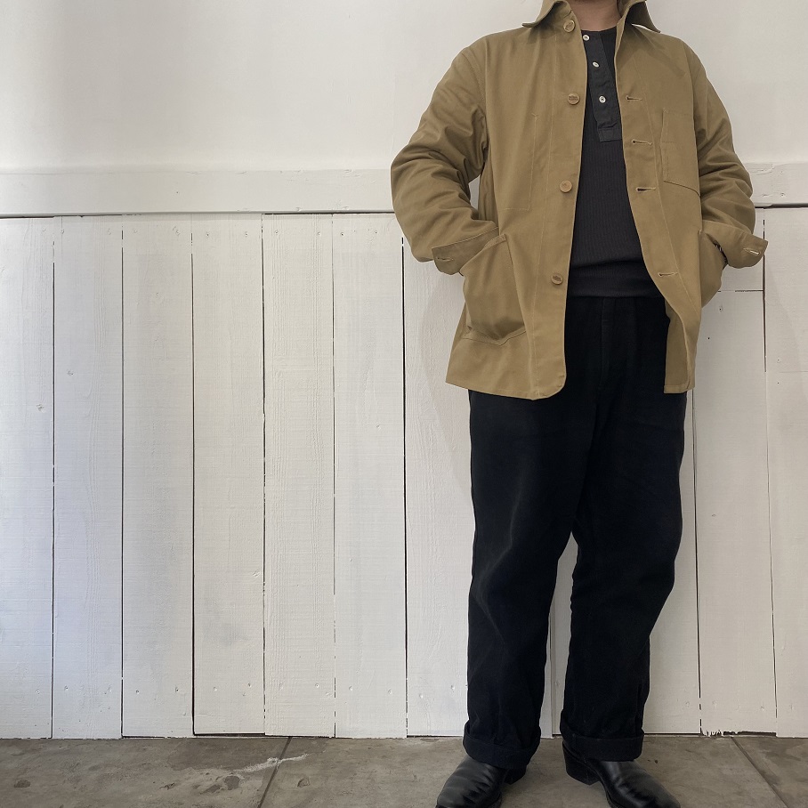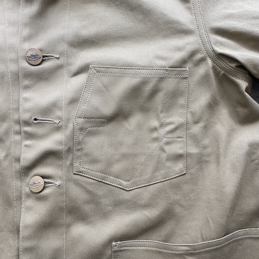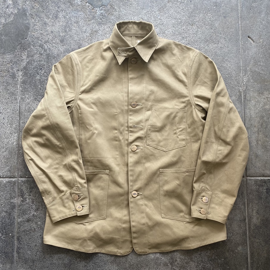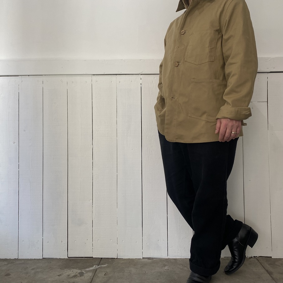 自身所有の1920年代から1930年代に作られた変形ポケットデニムカバーオールをモチーフにシーズンレスで着用いただけるビンテージのカバーオールの中でも非常に珍しく感じるベージュのツイル生地を使用して当店のオリジナルジャケットとして製作いたしました。