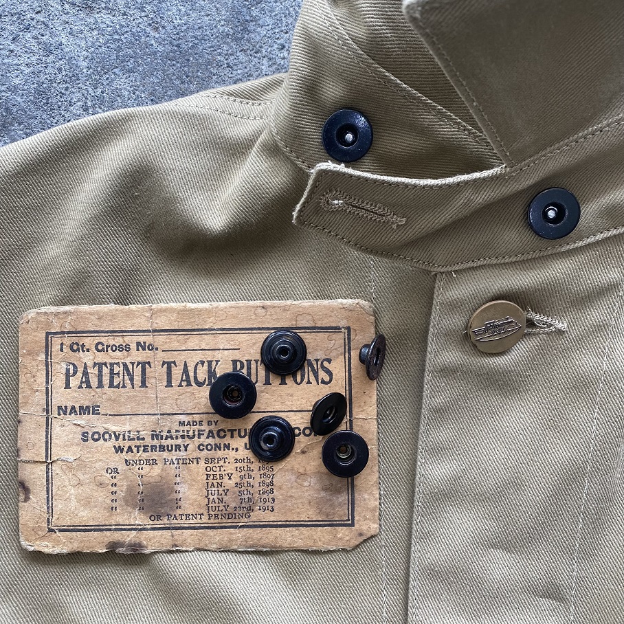 そして、今回のチンストラップ下の台衿部分に付く二つの打ち込みボタンには戦前の物と思われる年代のブラックラッカーのデッドストックのビンテージボタンを使用いたしました。