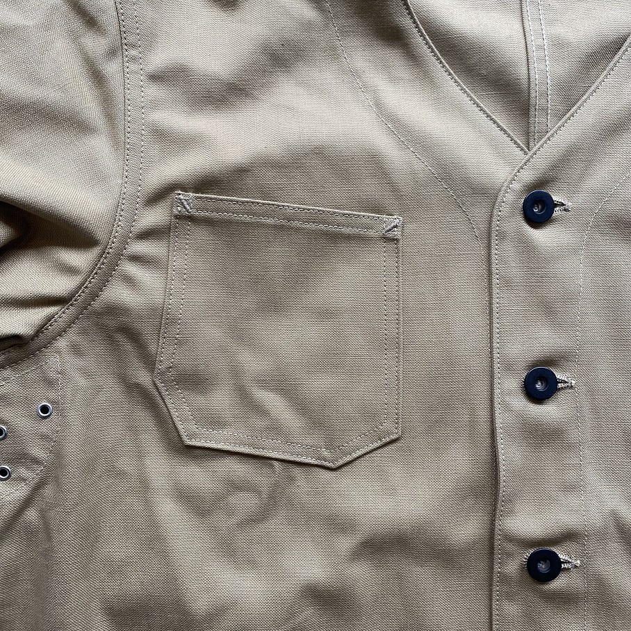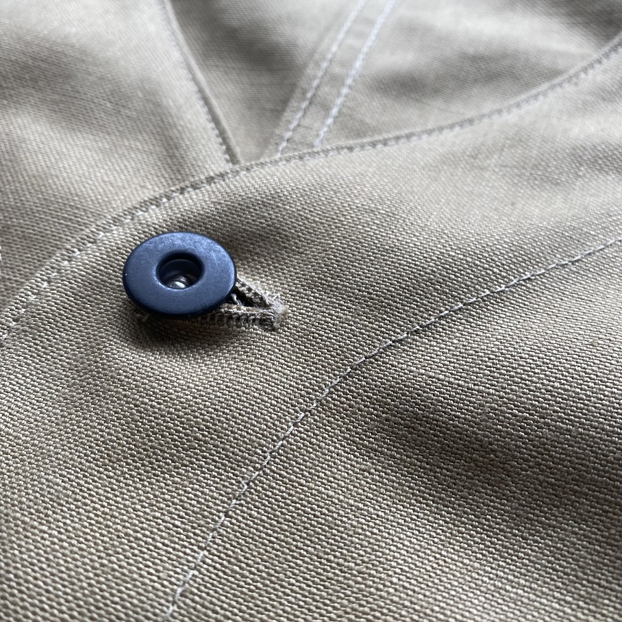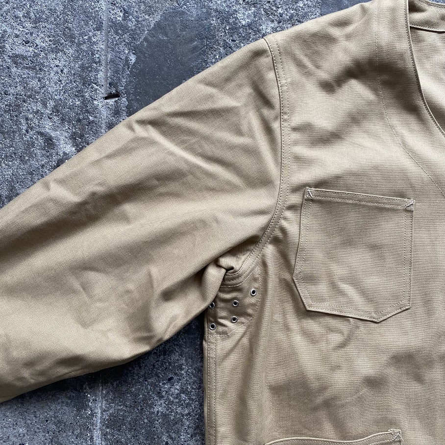 旧式の力織機で製織された高密度のセルビッチダック生地は着込み、洗濯を繰り返すほどに凹凸が増して更に素晴らしい雰囲気へと変化する生地感です。