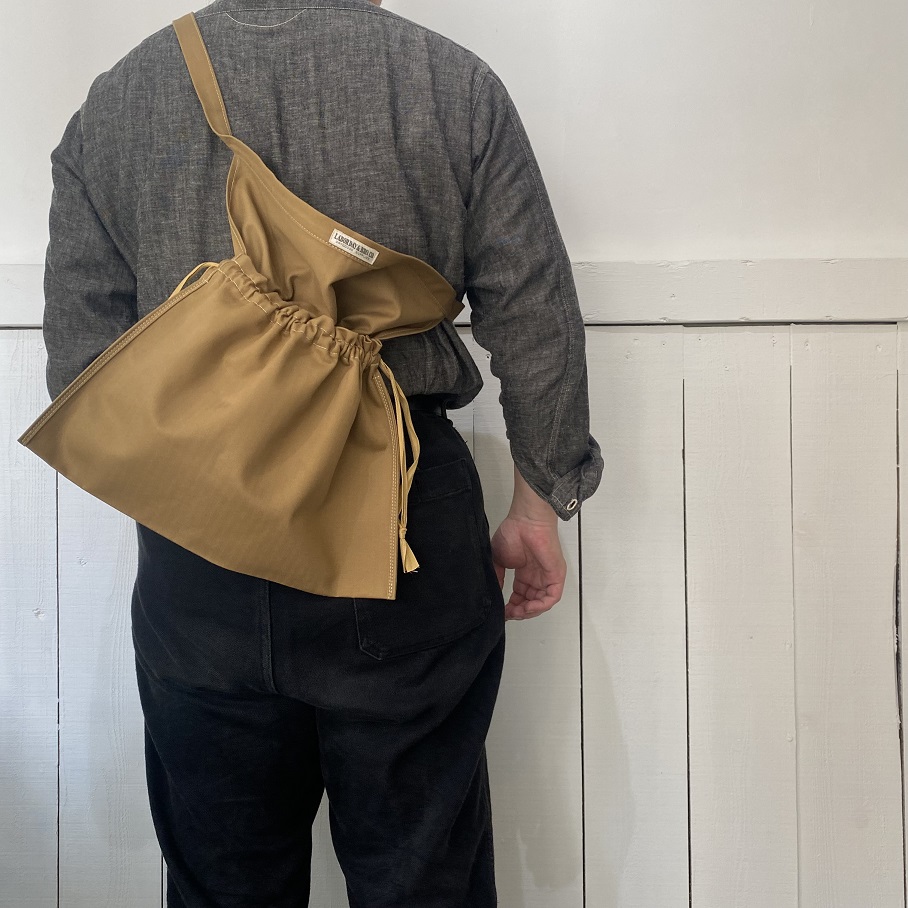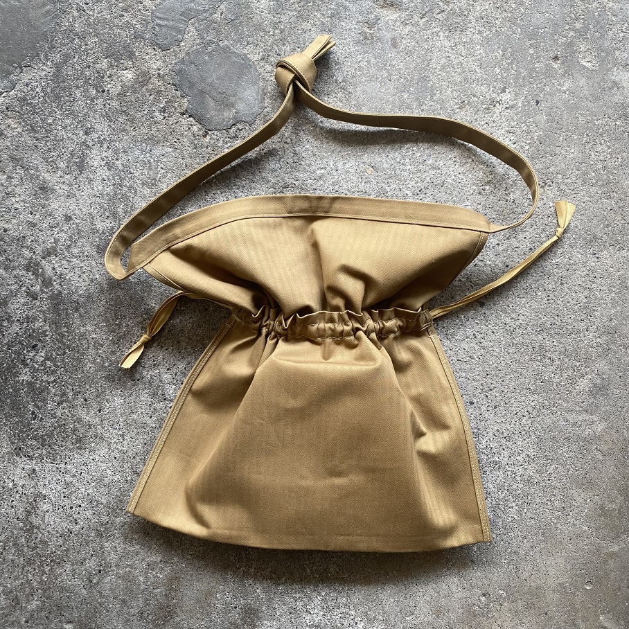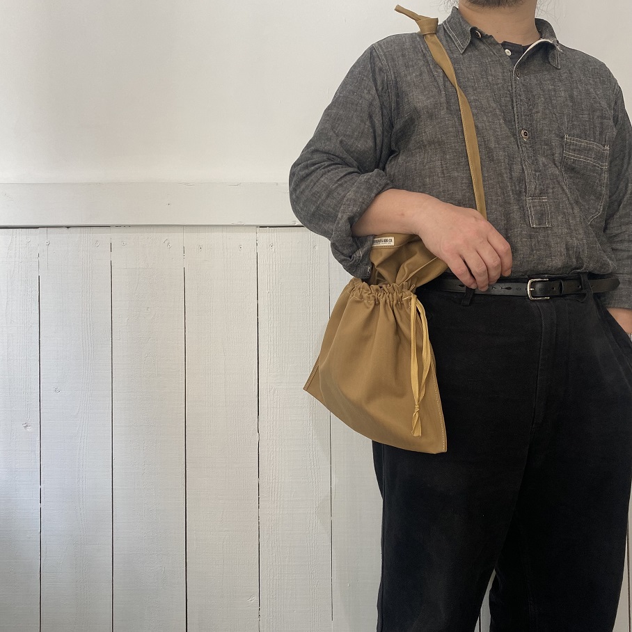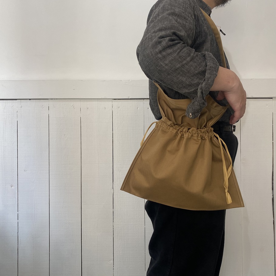 サイドの紐を絞れば巾着タイプのバッグにもなり、ショルダーにはもちろん、持ち手を結んで手に下げたり肩から掛けたりとアレンジの幅も広いアイテムとして使用していただけるバッグとなります。