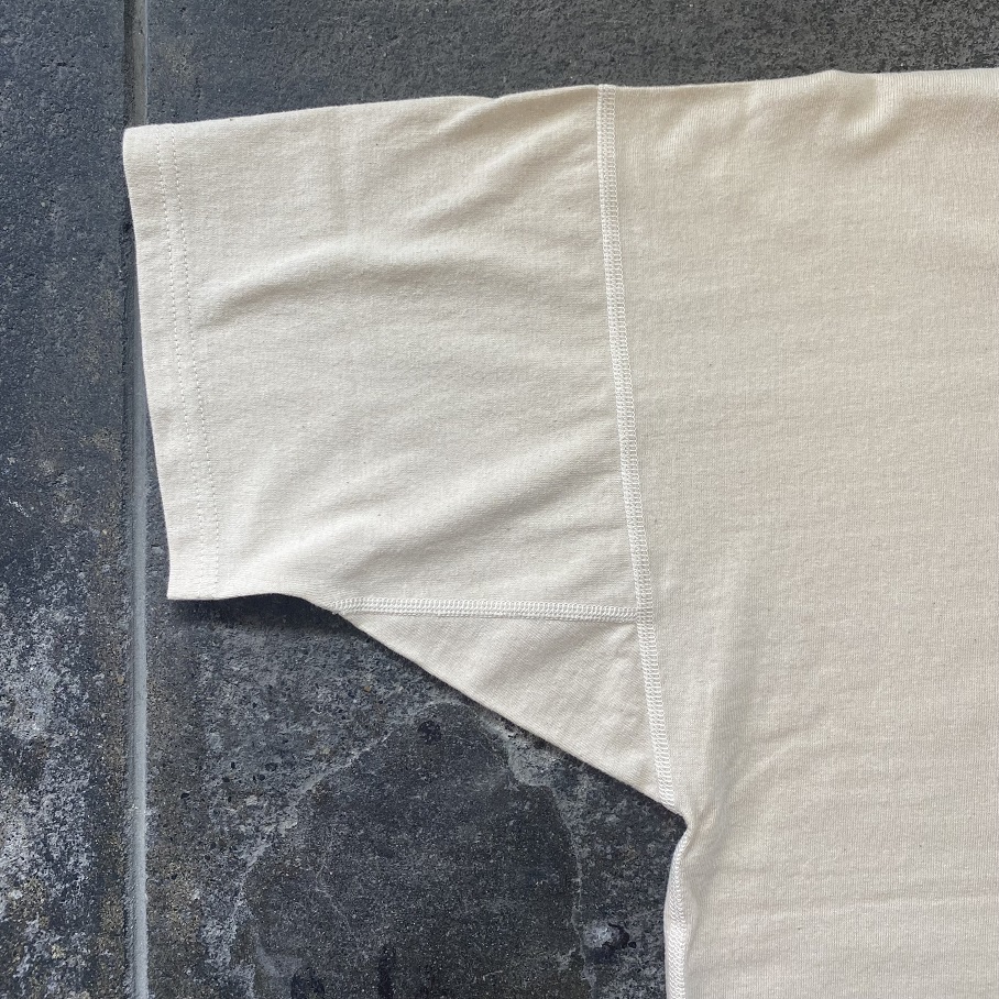 袖付けは”肩から真っ直ぐ”という表現がぴったりのステッチラインです。古のアンダーウェアがそうであるように脇下にマチが付き運動量を確保している点も見逃せないディティールとなります。
