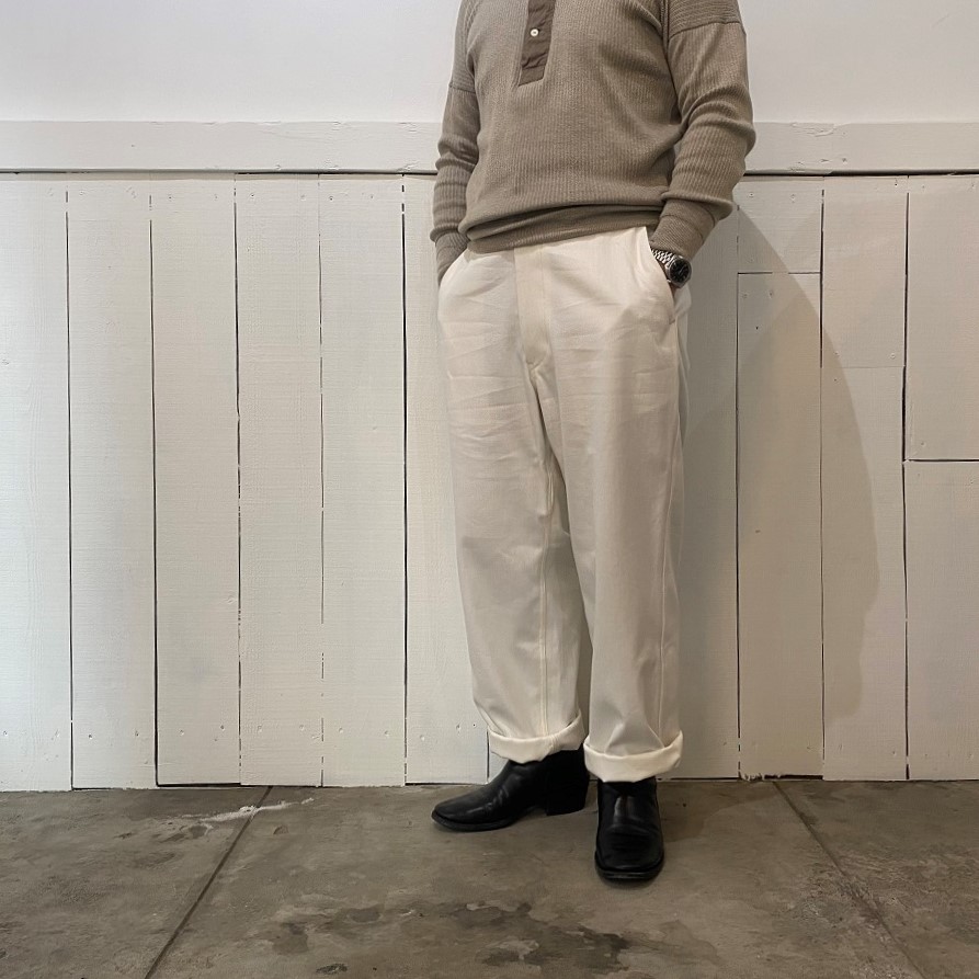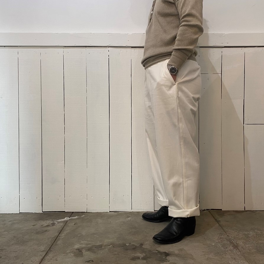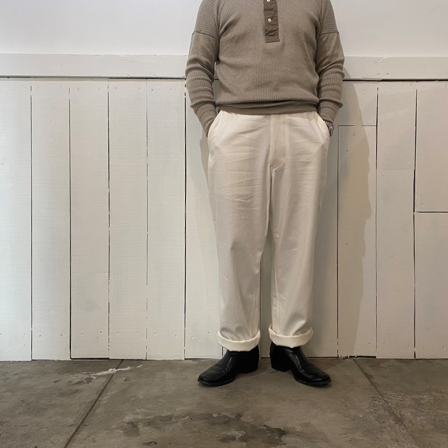 今回ご紹介させていただくカラーはヘリンボーンホワイトとなり、汚れを気にしすぎずに着用・洗濯を繰り返し穿き込むことでより魅力的な一本へ成長してくれそうなパンツです。