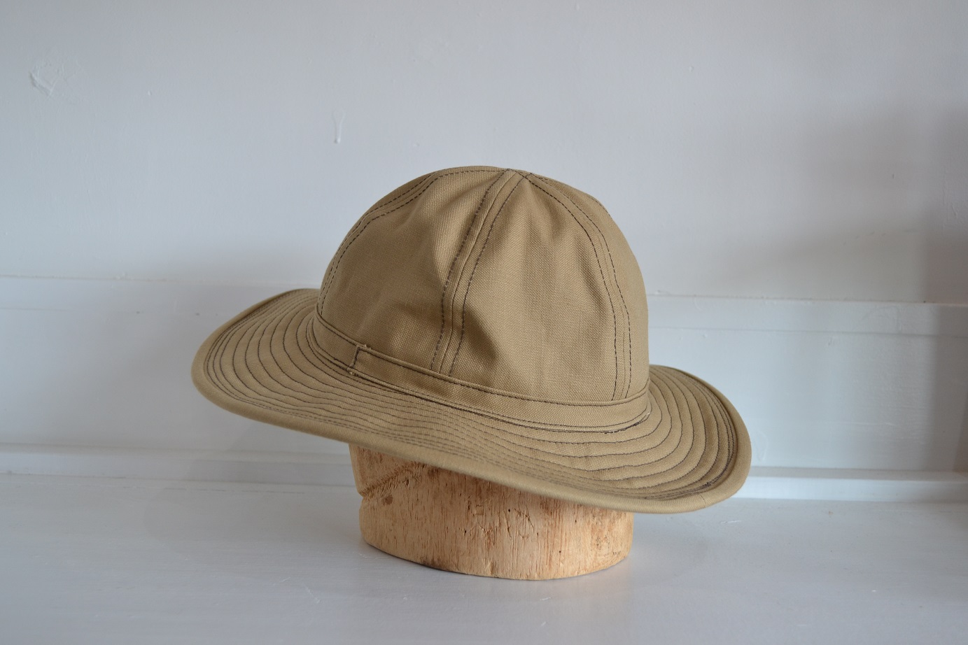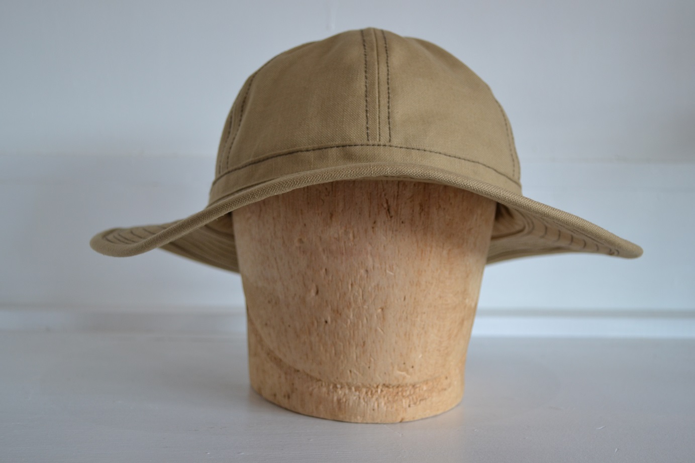 形状は1940年代の物を参考にしておりますが、ベージュに近いブラウンカラーのファティーグハットとなりますので1910年代のWW1時代に被られていたファティーグハットのような印象となります。