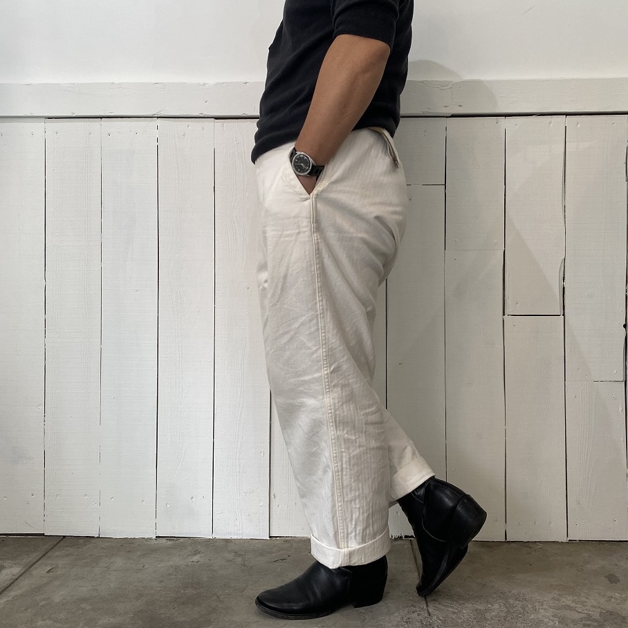 今回ご紹介させていただくカラーはヘリンボーンホワイトとなり、汚れを気にしすぎずに着用・洗濯を繰り返し穿き込むことでより魅力的な一本へ成長してくれます。