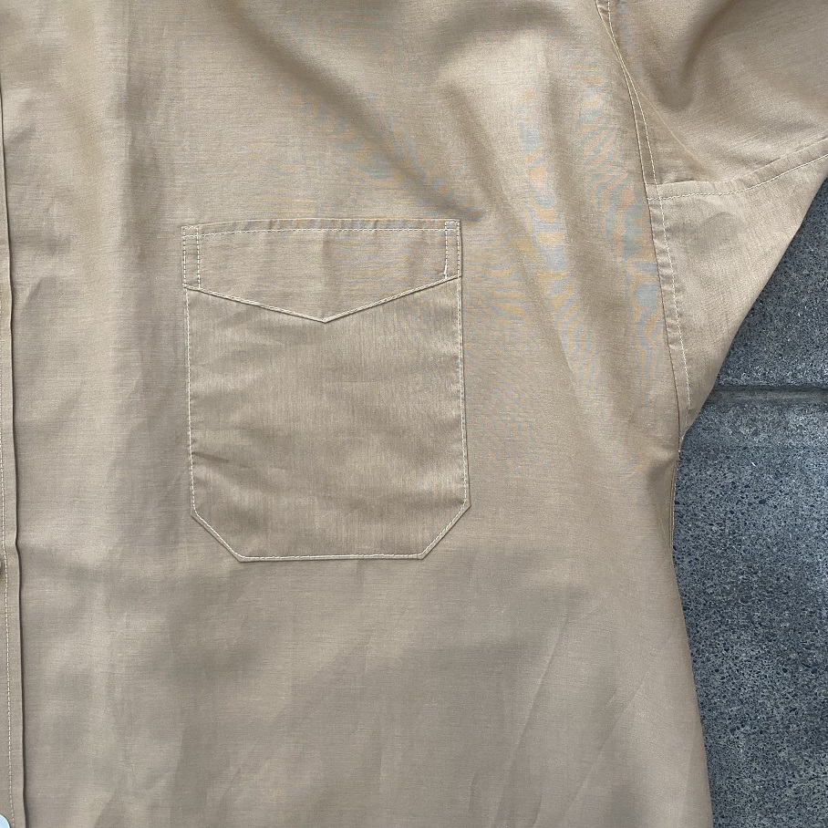 Vヘムの付く胸ポケットはやや下目のボディの中央付近に取り付けられており、生地目が横使いになっております。