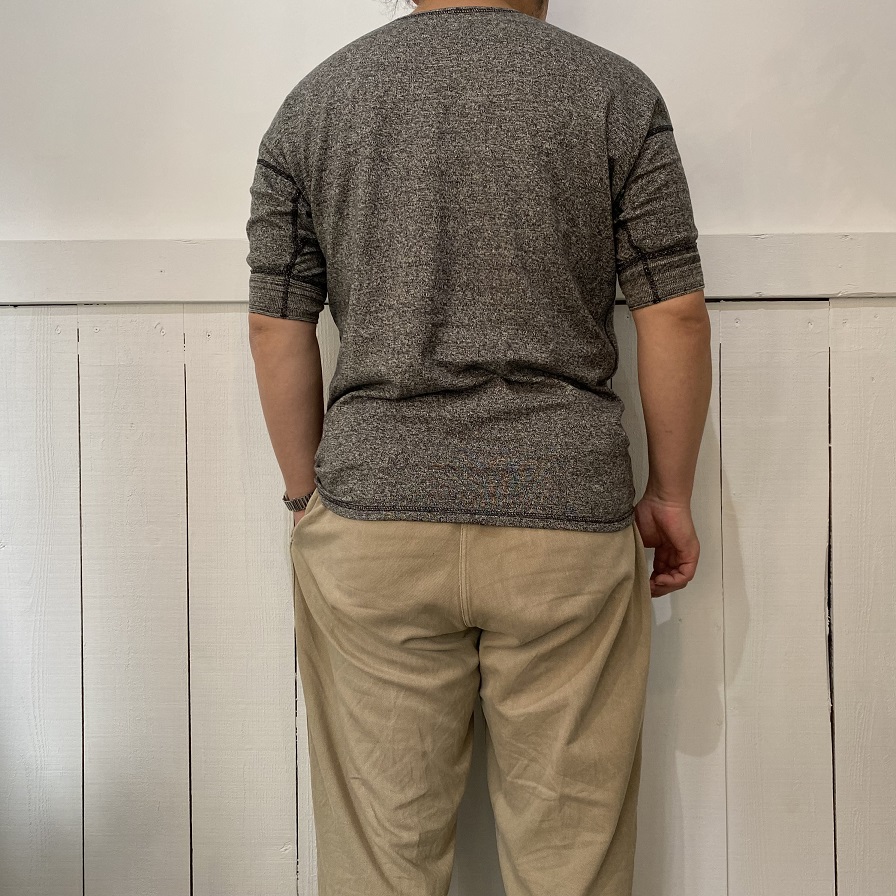 定番のヘンリーネック・クルーネックとの最大の違いは裾リブが付かないシンプルなTシャツ形状の裾になっている点が挙げられます。
