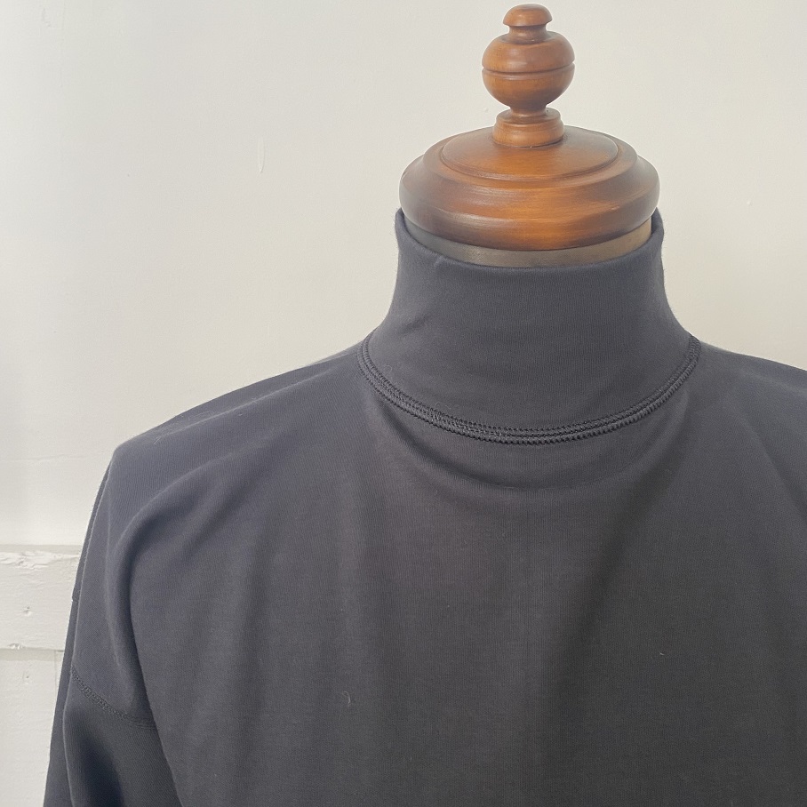 ハイネックとタートルネックの丁度中間のような”MOCK NECK”ですのでそのままでも折り返しても着用が可能です。その日の気温やコーディネートに合わせて着こなしを変えていただければと思います。