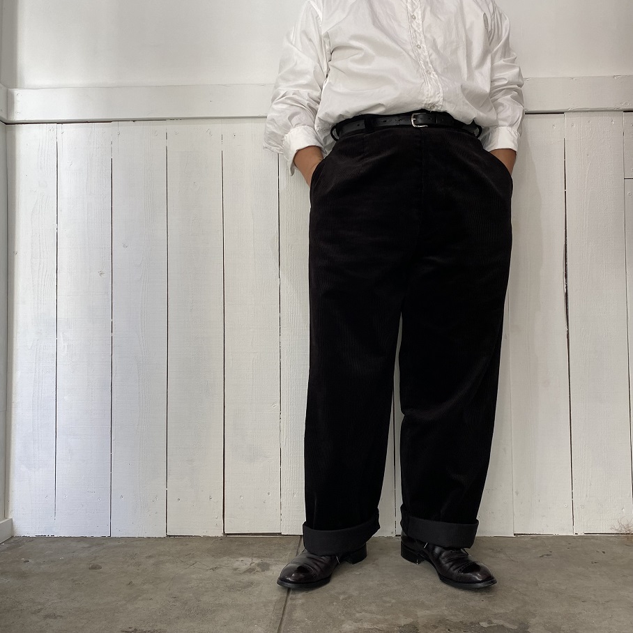 私自身が欲しかった仕立ての良いブラックコーデュロイトラウザーズ。ワークパンツスタイルですが素材や色と相まって、とても品のあるパンツに仕上がりました。