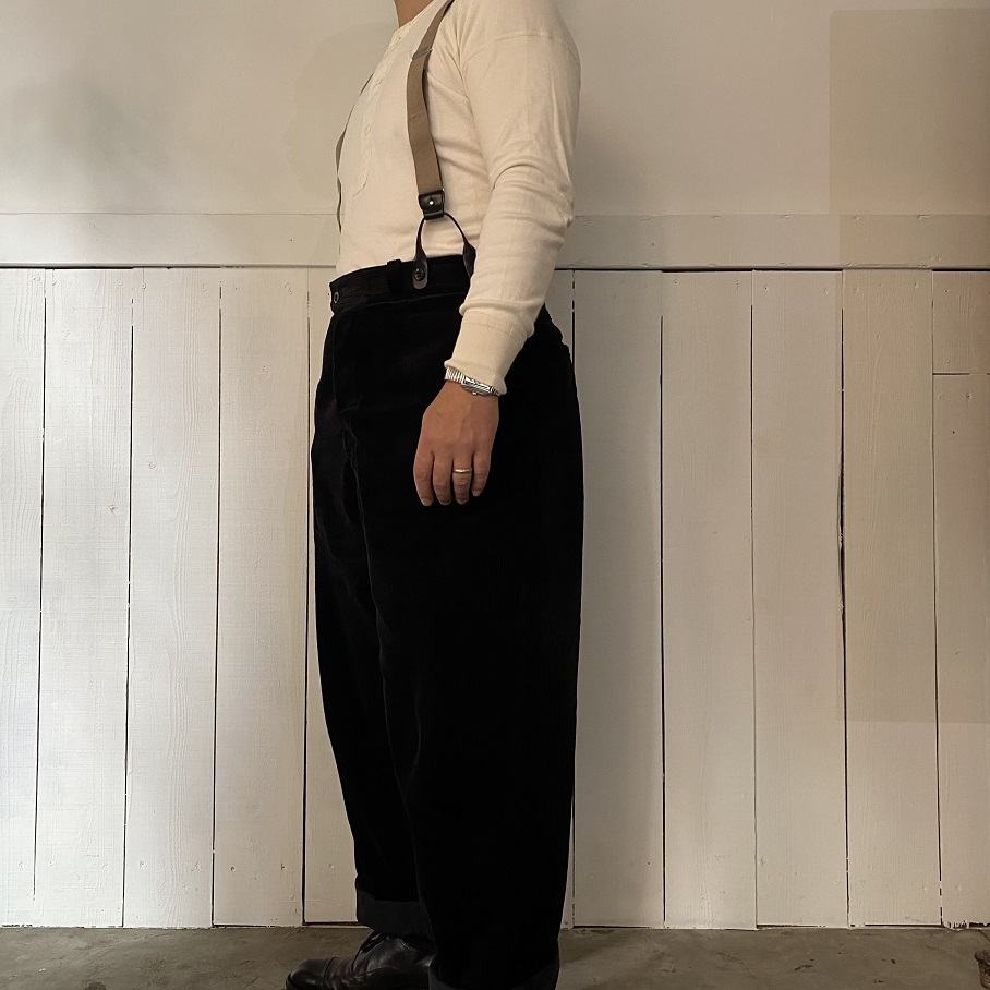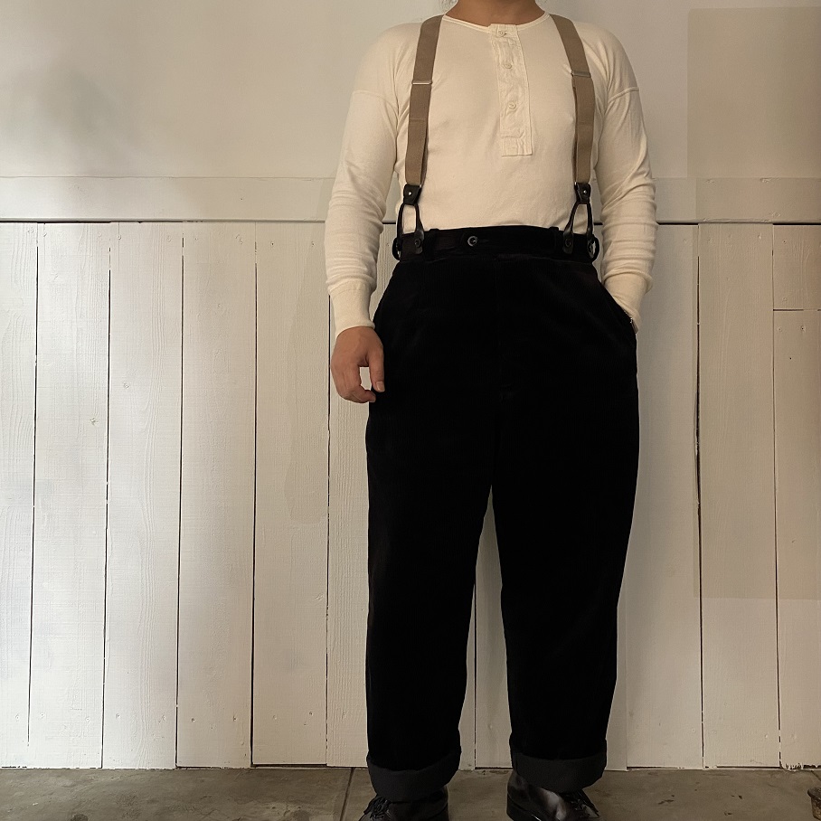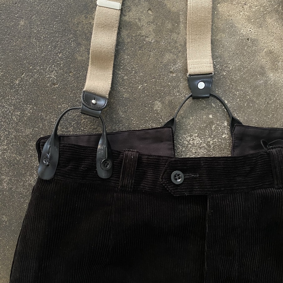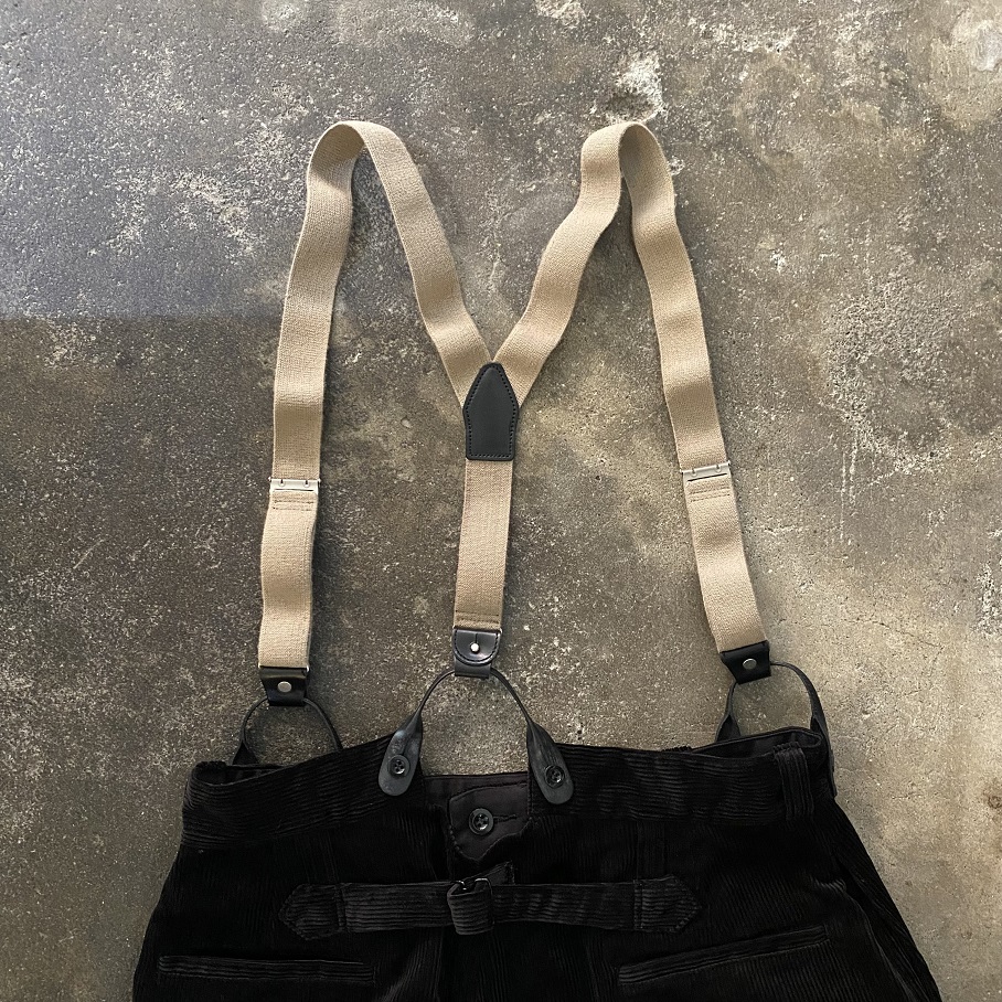 サスペンダーボタンの付くボトムスとの相性は素晴らしく良く、ベルトで着用するのとはまた違った美しいシルエットが生まれるのがサスペンダーの良いところかと思います。