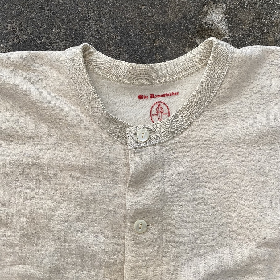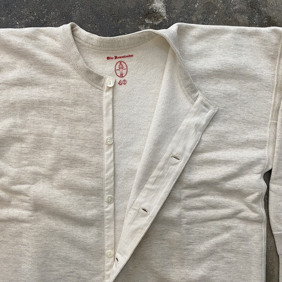OLDE HOMESTEADERより毎年大変ご好評をいただいております”COTTON FLEECE”シリーズの”Opend Front Long Sleeve”のECRU HEATHERが入荷致しましたので早速ですがご紹介させていただきます。