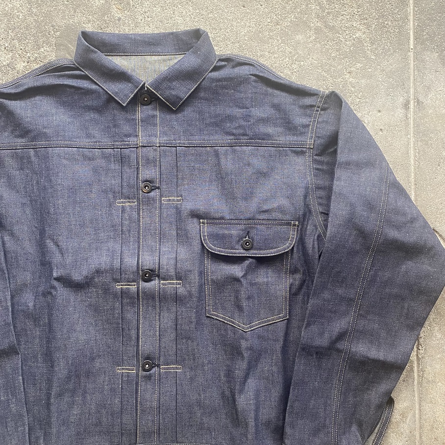 世界的にも有名なデニムジャケットの通称”ファースト”と呼ばれるデニムジャケットをモチーフにオールシーズンで着用が可能なようにデッドストックのような”ドス黒い”印象のある9.5ozのライトオンスデニムを使用して製作した当店オリジナルのデニムジャケットを製作いたしました。