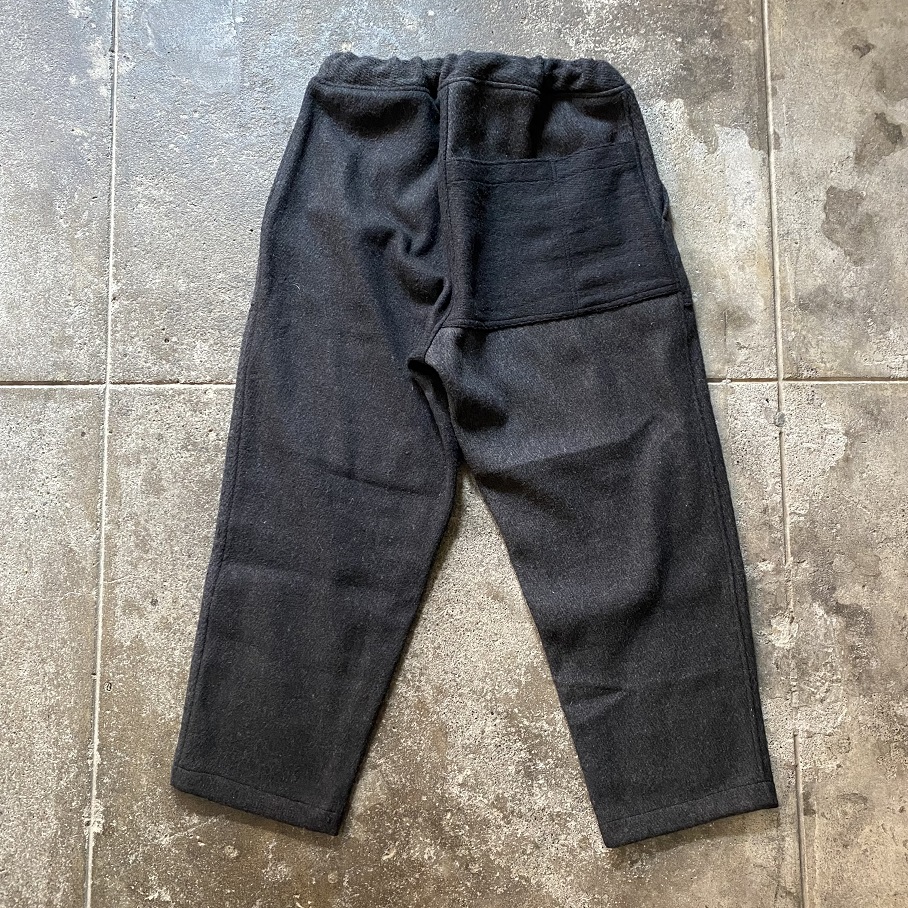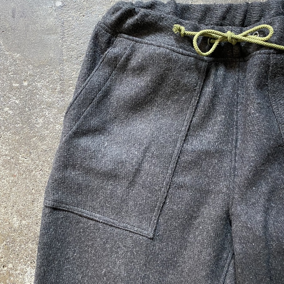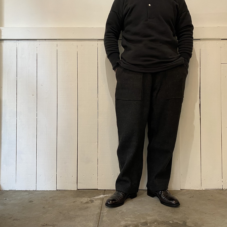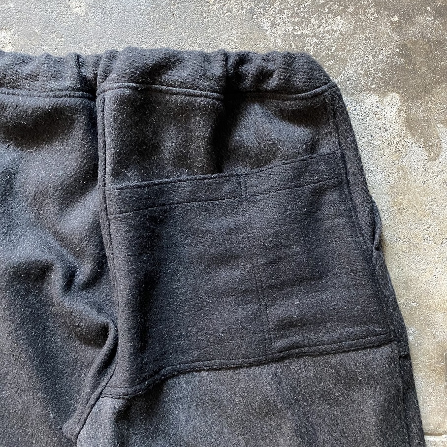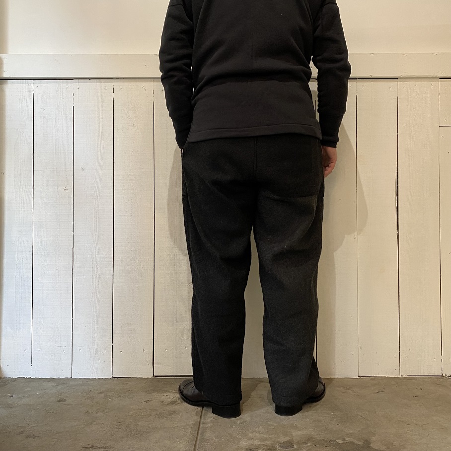 しっかりとした地厚のあるデッドストックのウールラグ生地を贅沢に使用したパンツとなりますが、形はカジュアルなスタイルに取りいれやすいイージーパンツスタイルとなります。