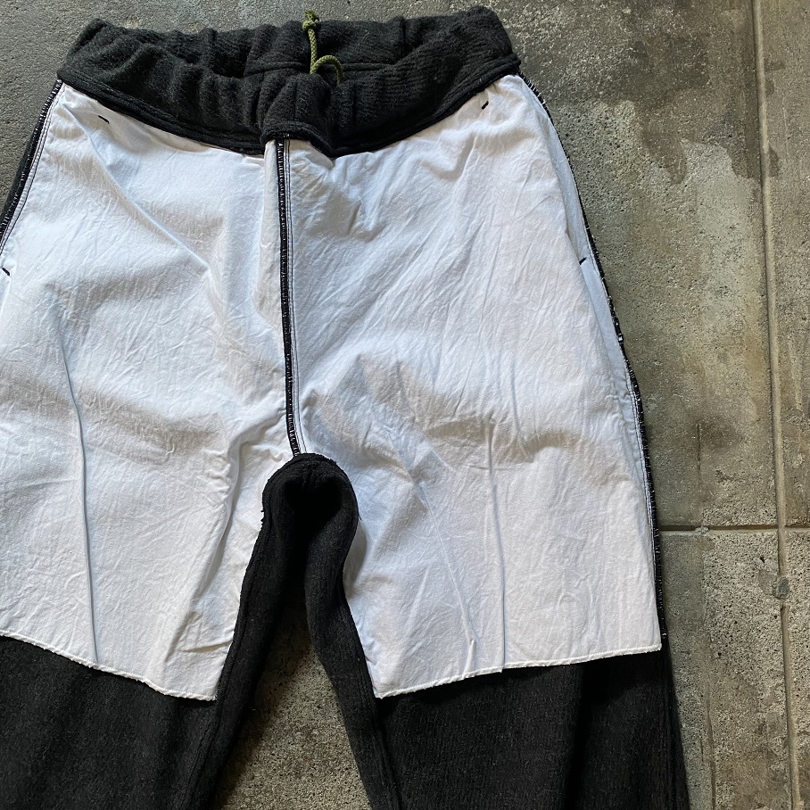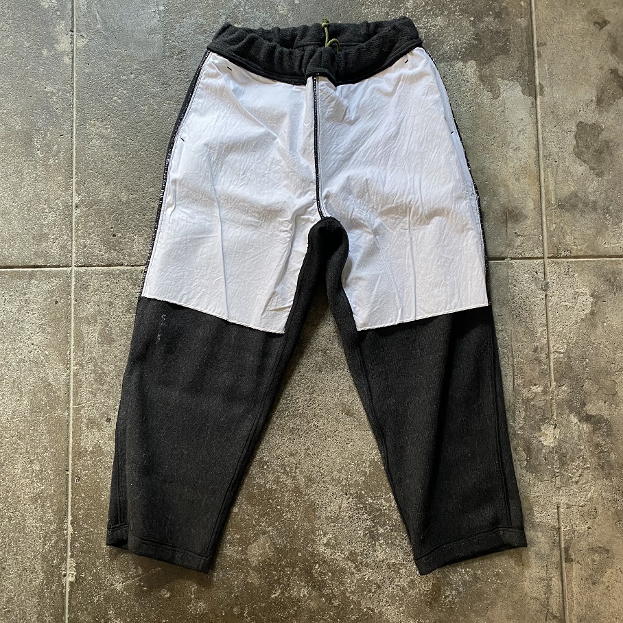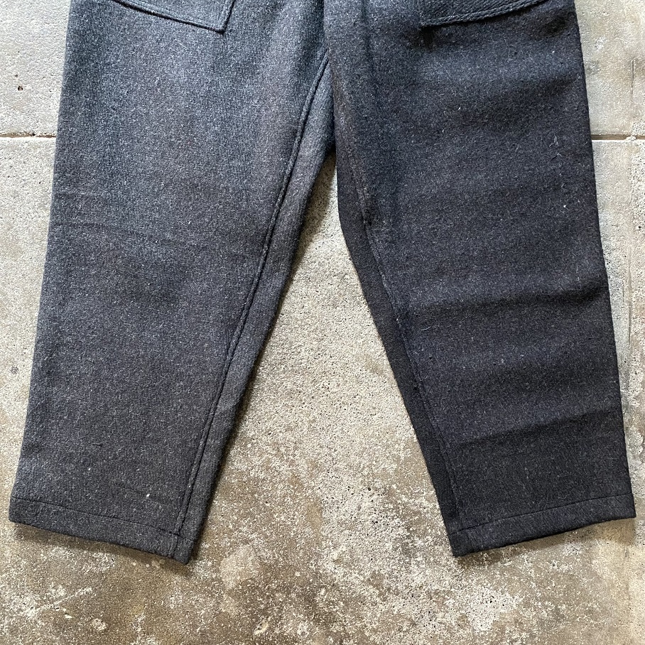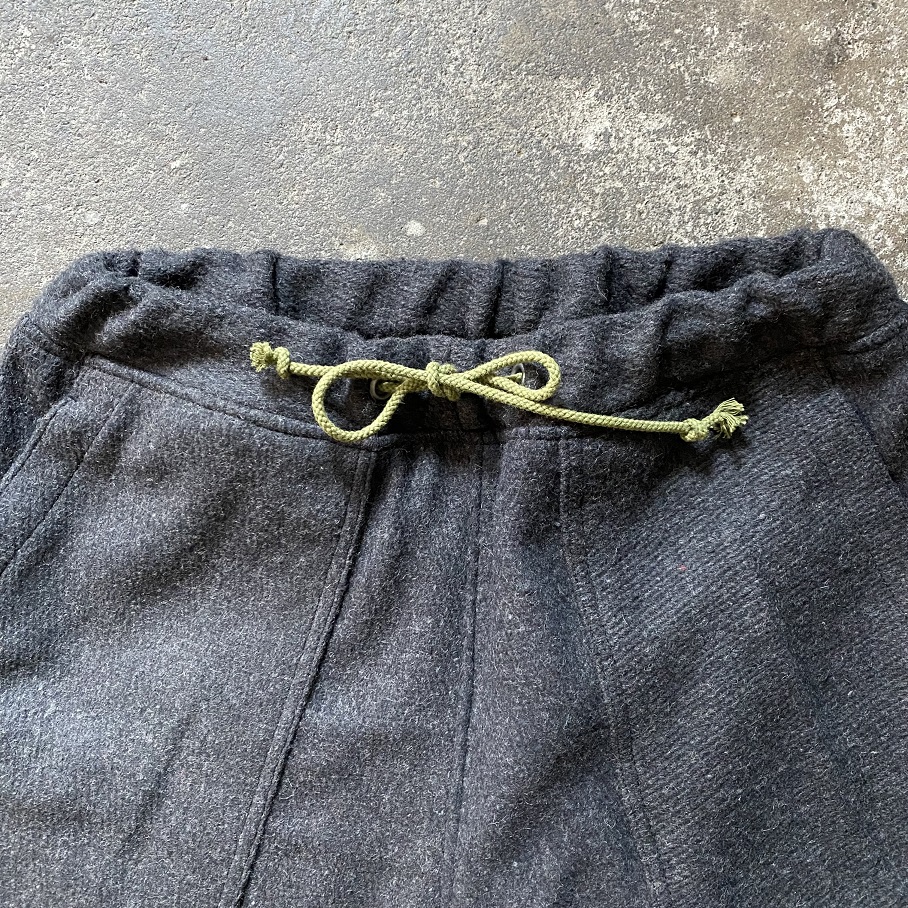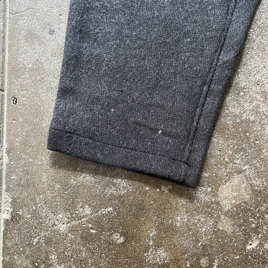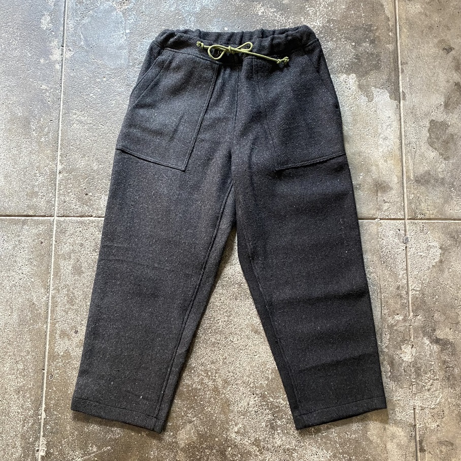 しっかりとした地厚のあるデッドストックのウールラグ生地を贅沢に使用したパンツとなりますが、形はカジュアルなスタイルに取りいれやすいイージーパンツスタイルとなります。