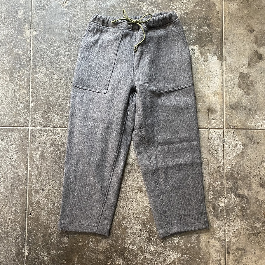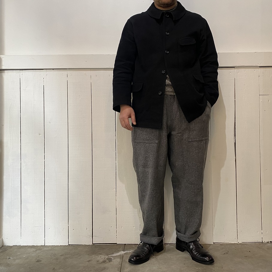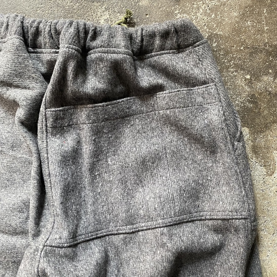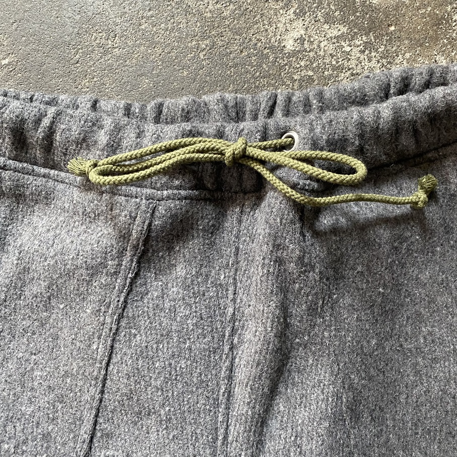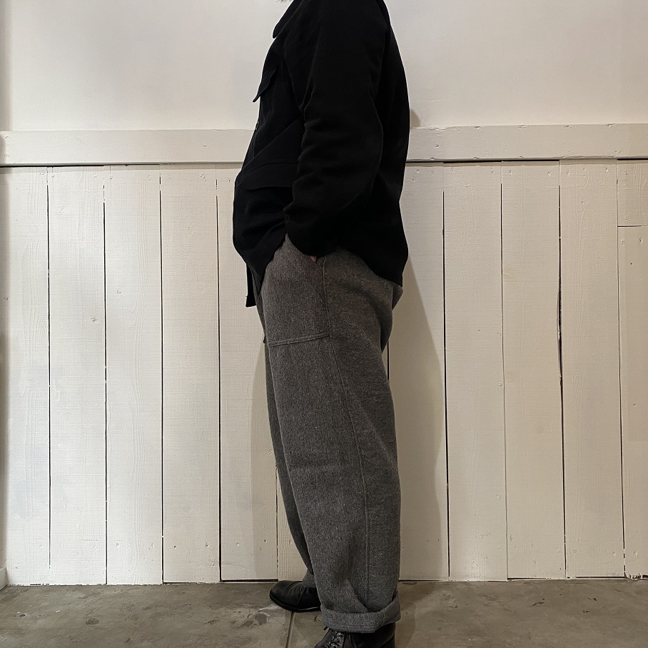 しっかりとした地厚のあるデッドストックのウールラグ生地を贅沢に使用したパンツとなりますが、形はカジュアルなスタイルに取りいれやすいイージーパンツスタイルとなります。