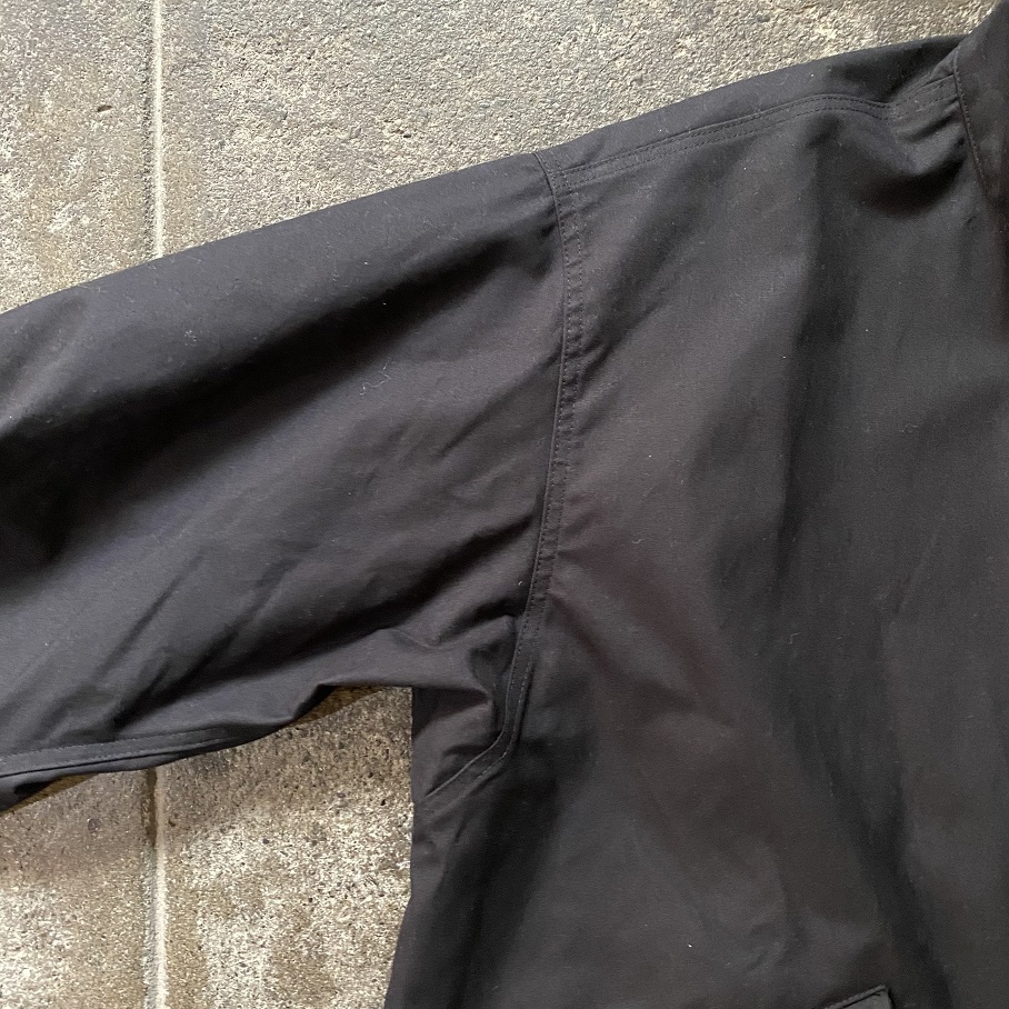 このSTAY WAX クロスの特徴は、ワックスを生地に染込ませて表面に層を作ることで防水性、撥水性を高めている為、従来の英国の伝統的なオイルドジャケットと比べ、オイルのベタつきがほぼ無く、更に着用を繰り返すことでワックスが気にならない程の質感になり、従来のオイルドコットンジャケットのような臭いもありません。