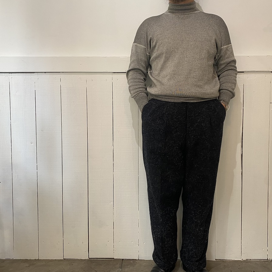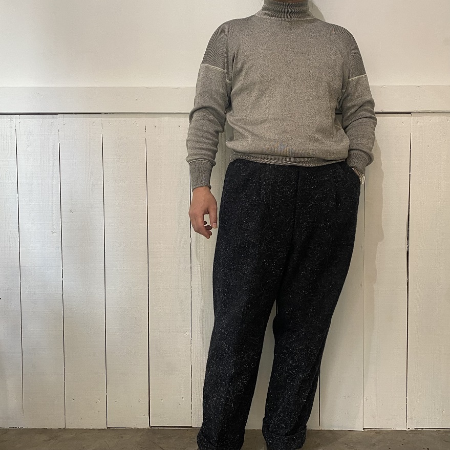 ハイネックとタートルネックの丁度中間のような”MOCK NECK”ですのでそのままでも折り返しても着用が可能です。その日の気温やコーディネートに合わせて着こなしを変えていただければと思います。