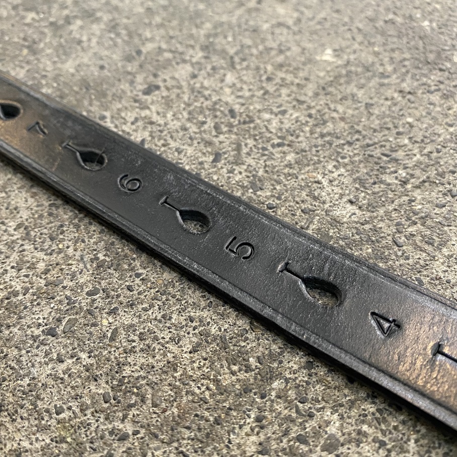 元々は鐙の高さを左右で合わせるための雫型のベルトホール横の数字がディテールとして採用されており、特徴的なディティールとなっております。