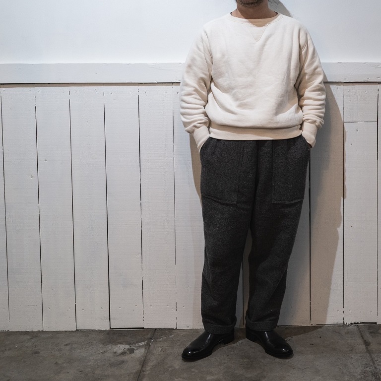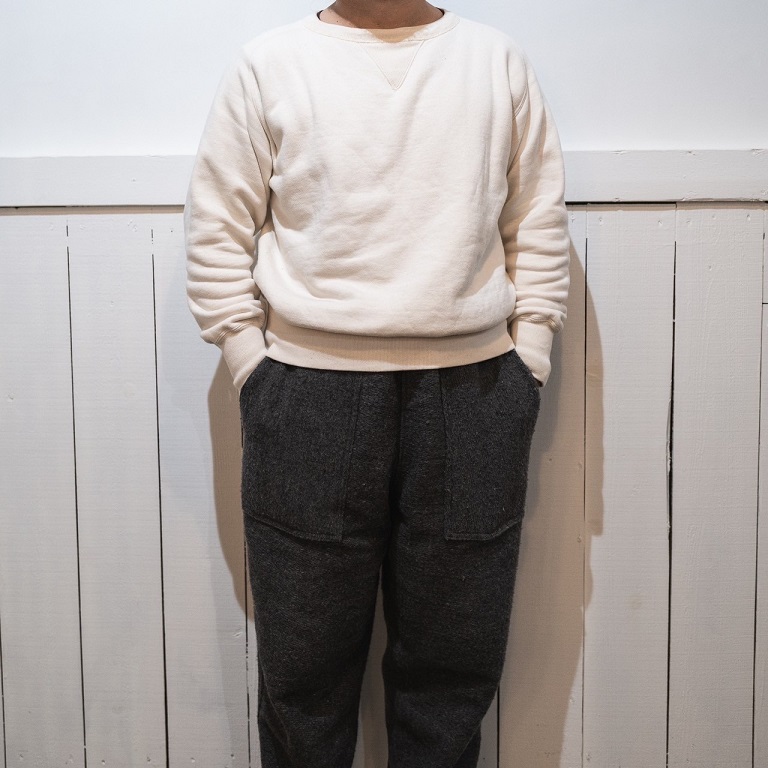 同ブランドのTシャツFULL BACK “1940’s STYLE Crew-Neck Tube Tee”で38サイズを着用しておりますが、こちらのスウェットシャツは40サイズで着用しております。