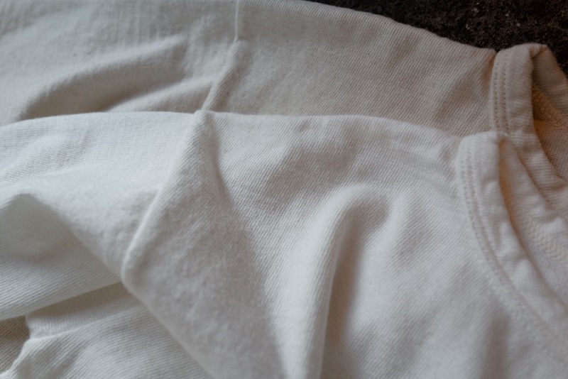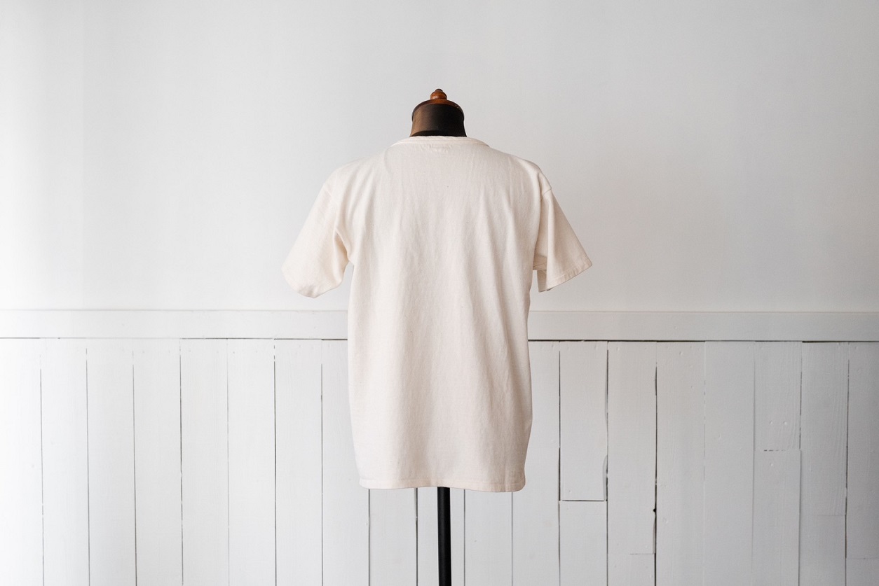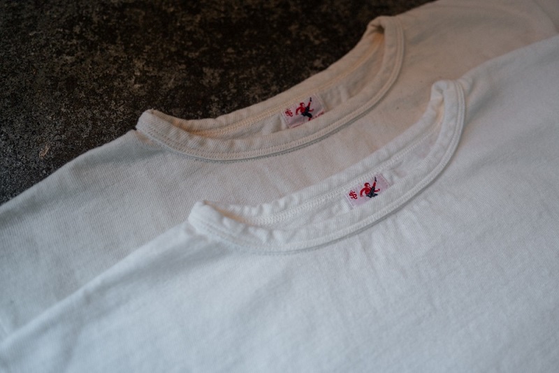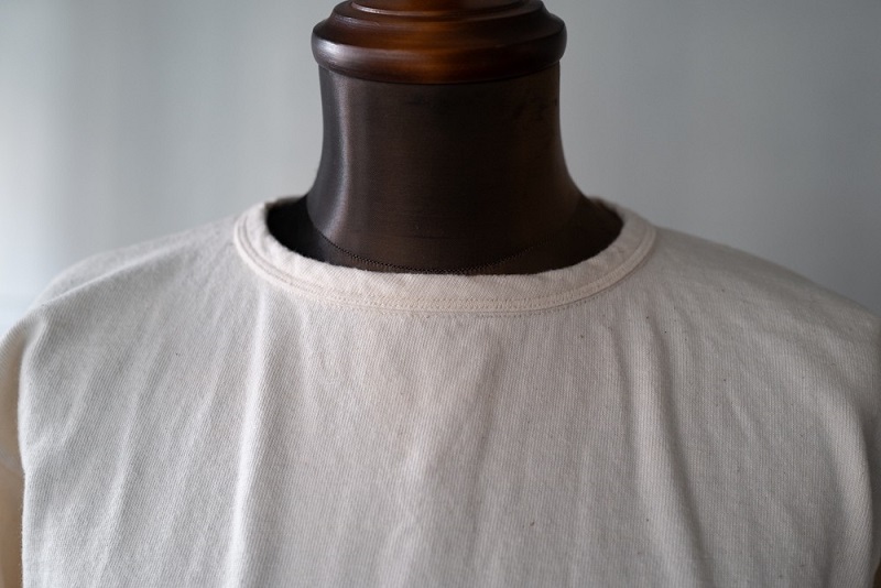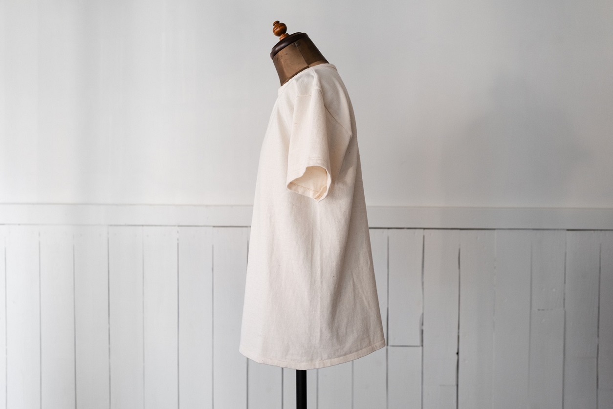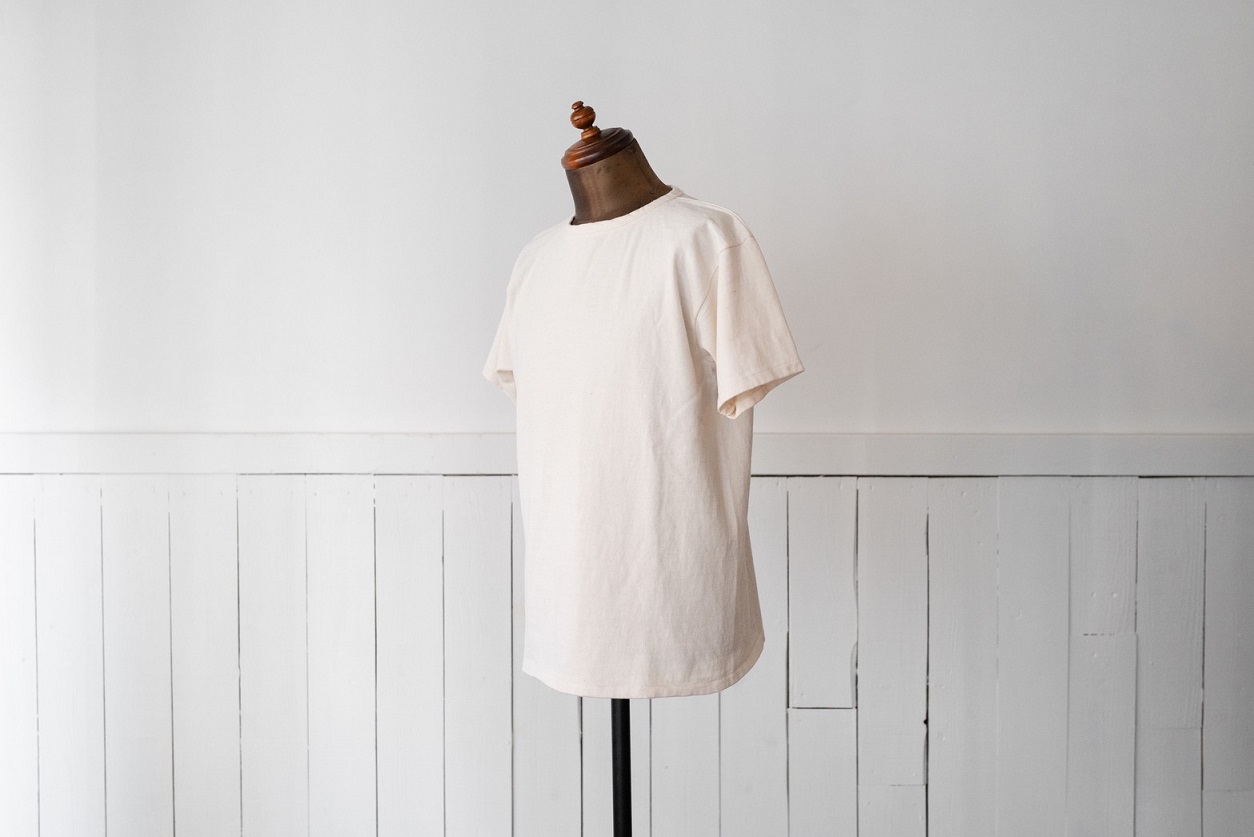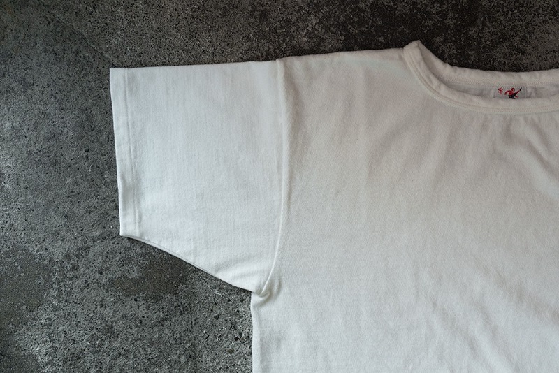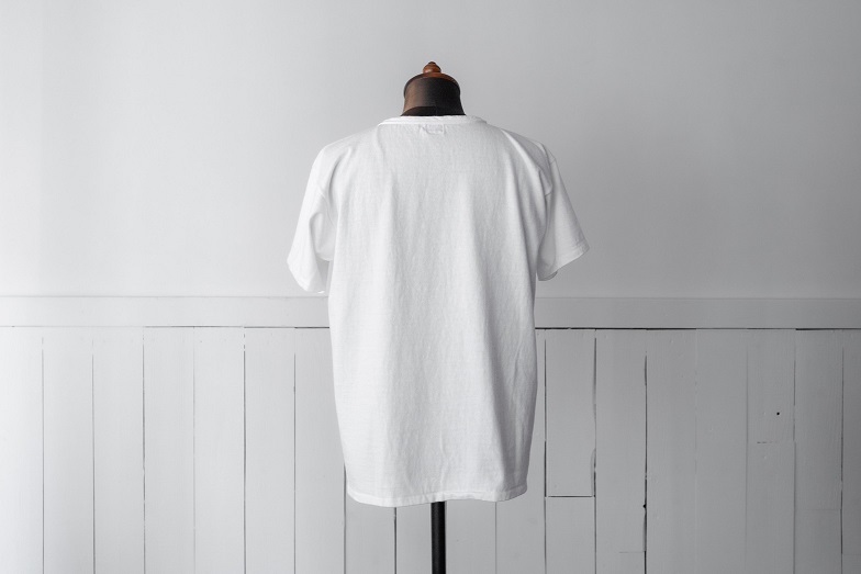 今回、リリースとなるのはこのモデル専用で編立られた古い吊り編み機を使用した丸胴生地を使用したクルーネックTeeとなります。