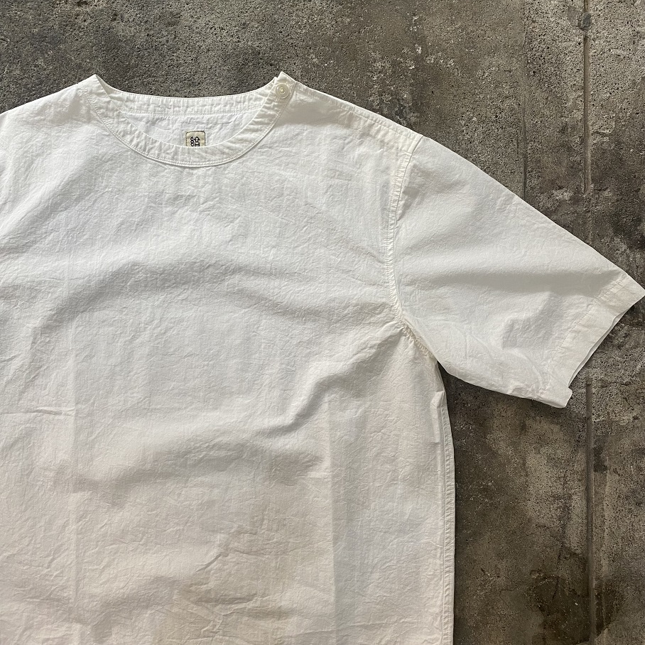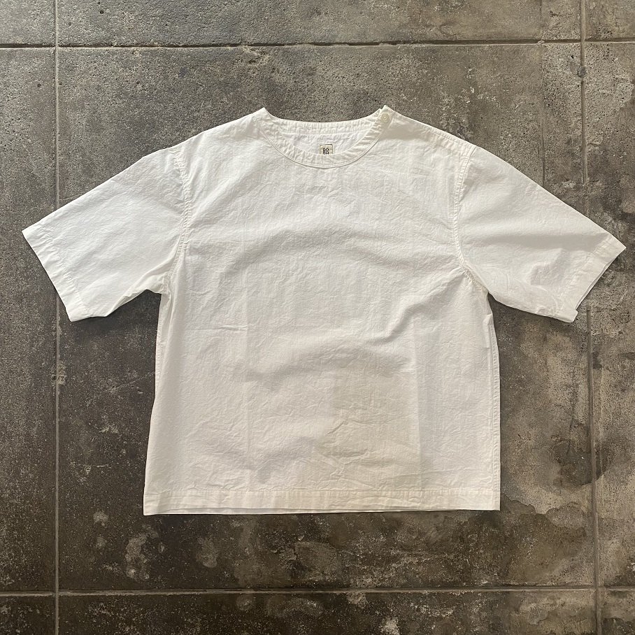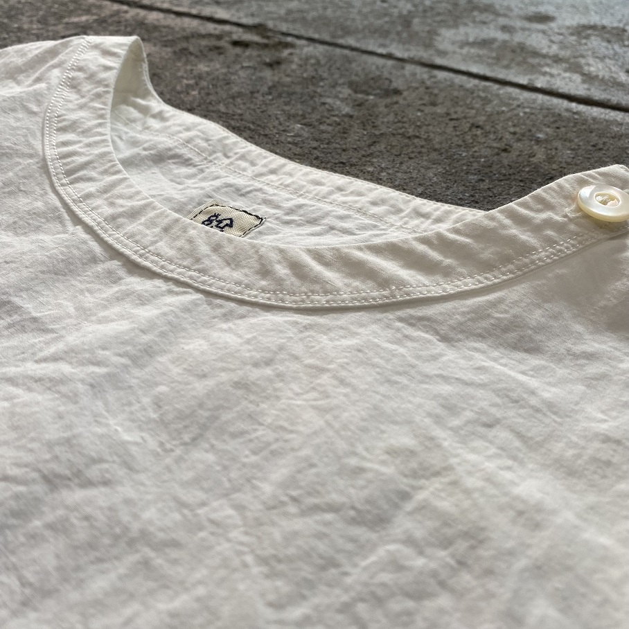 ネックサイド部分に一つだけ付くボタンにて着用することが出来、ディティールはポケットなども付かない非常にシンプルな物となりますが、着用した時の存在感はTシャツでもなく、襟付きのシャツでもない唯一無二の物となります。