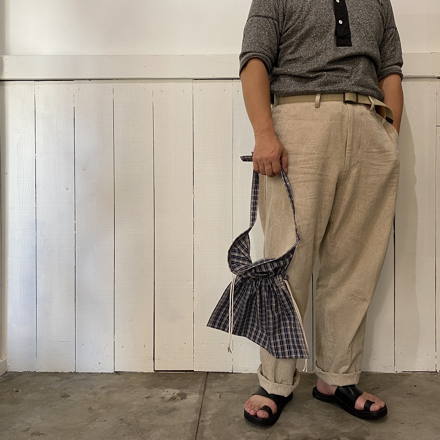 サイドの紐を絞れば巾着タイプのバッグにもなり、ショルダーにはもちろん、持ち手を結んで手に下げたり肩から掛けたりとアレンジの幅も広いアイテムとして使用していただけるバッグとなります。