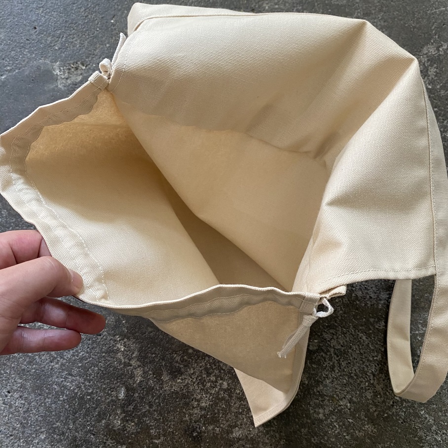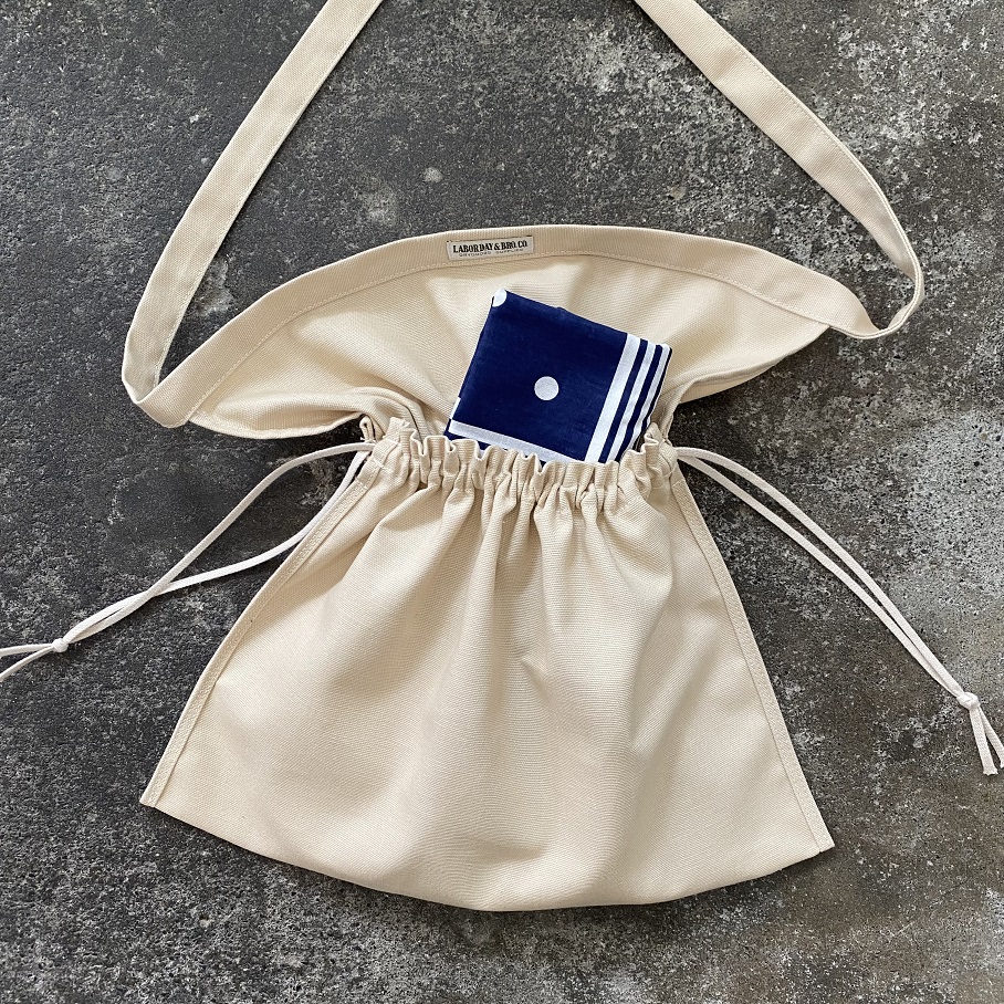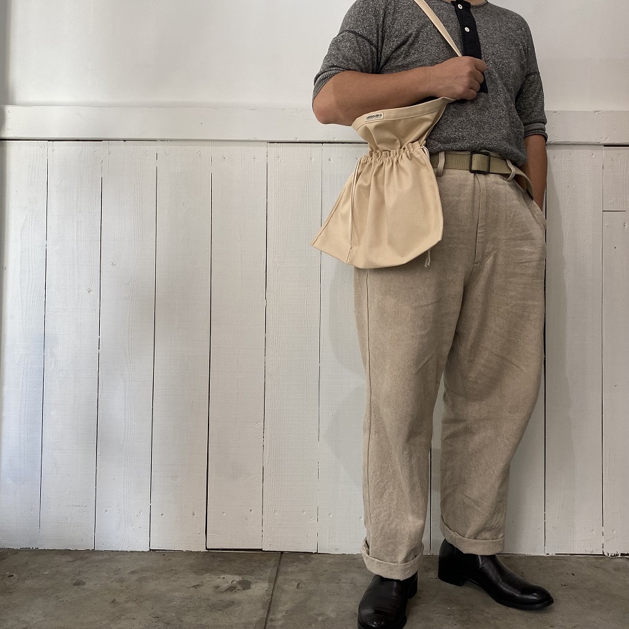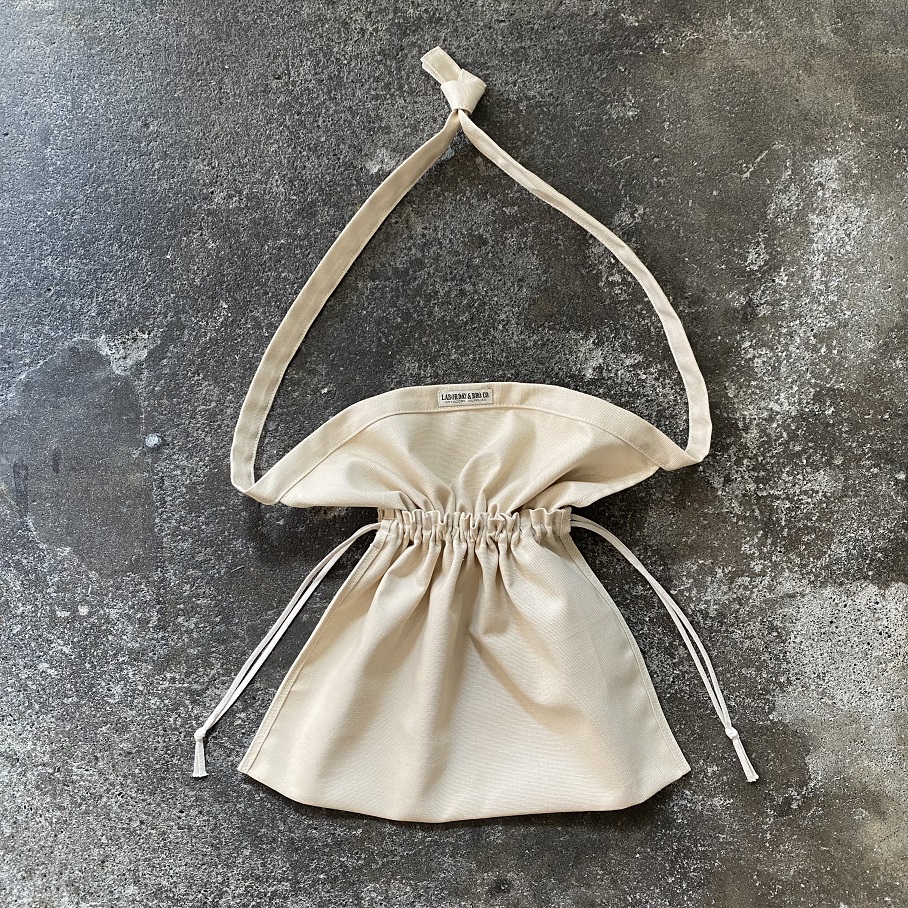 サイドの紐を絞れば巾着タイプのバッグにもなり、ショルダーにはもちろん、持ち手を結んで手に下げたり肩から掛けたりとアレンジの幅も広いアイテムとして使用していただけるバッグとなります。