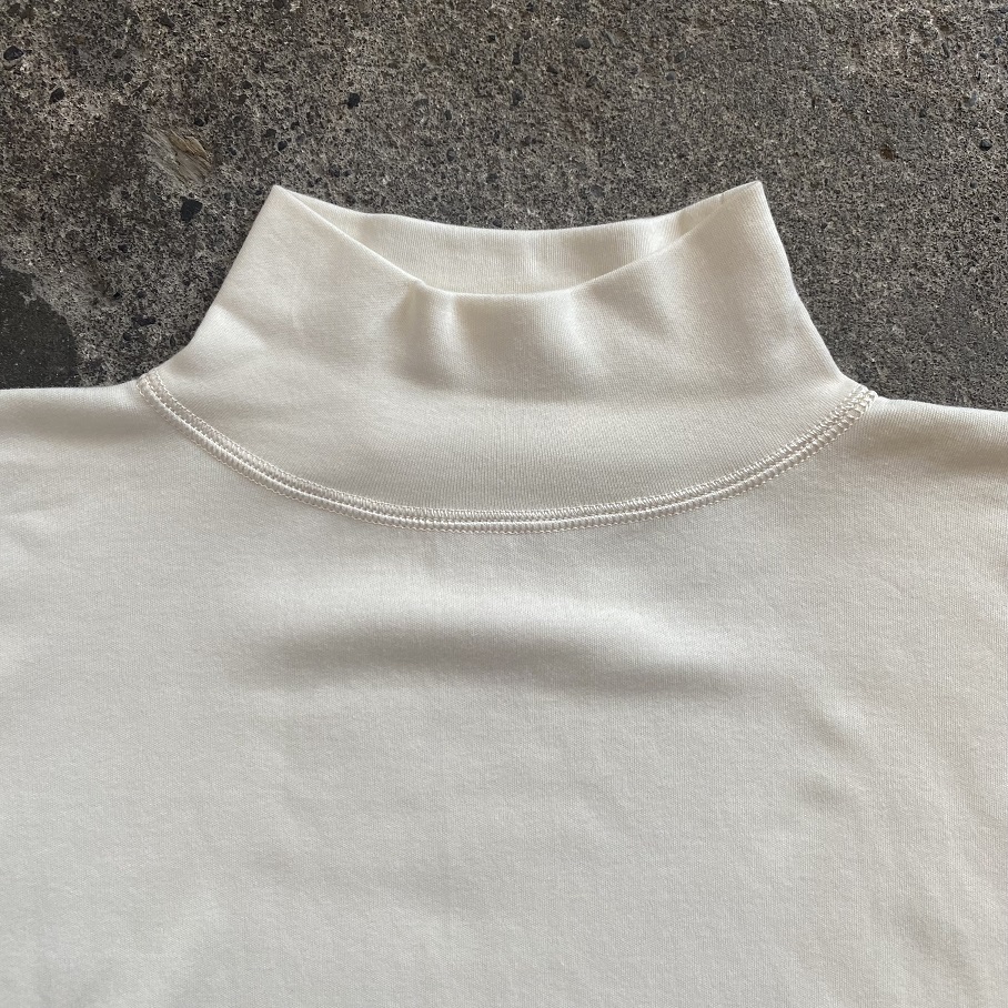 ハイネックとタートルネックの丁度中間のような”MOCK NECK”ですのでそのままでも折り返しても着用が可能です。その日の気温やコーディネートに合わせて着こなしを変えていただければと思います。