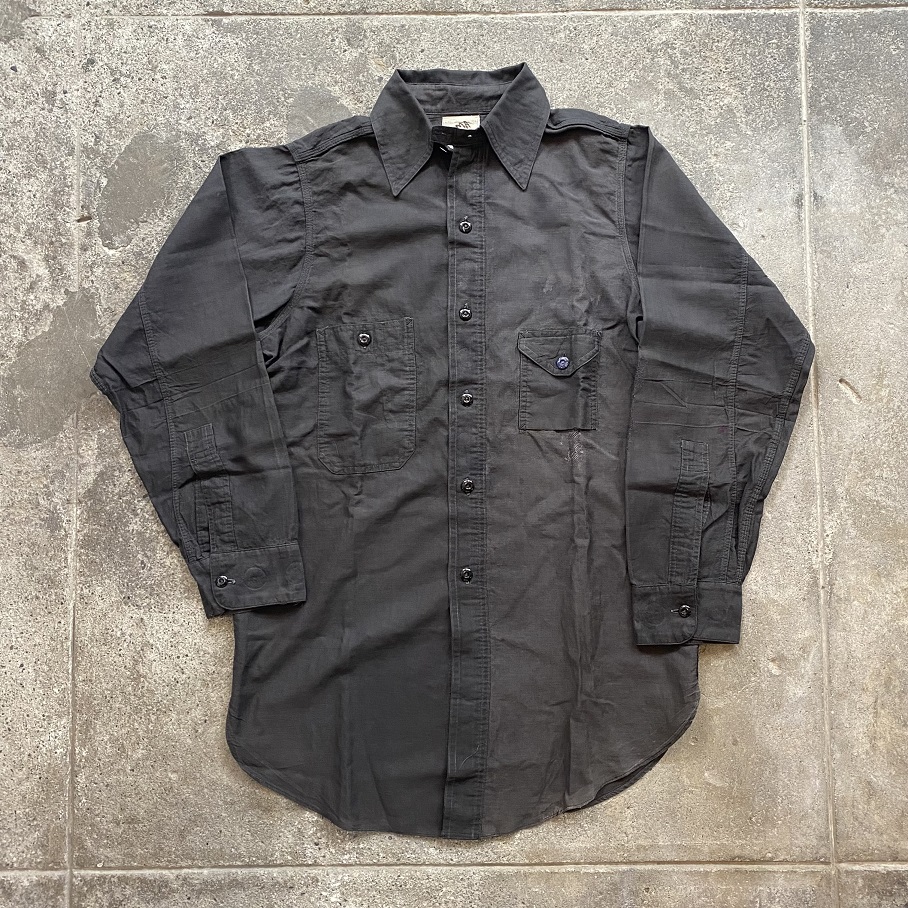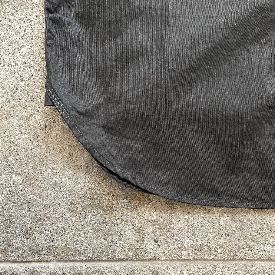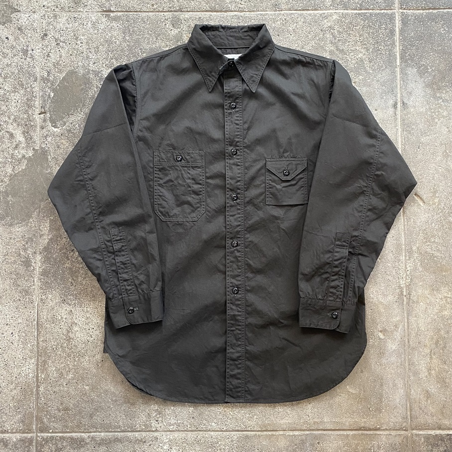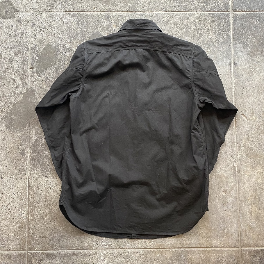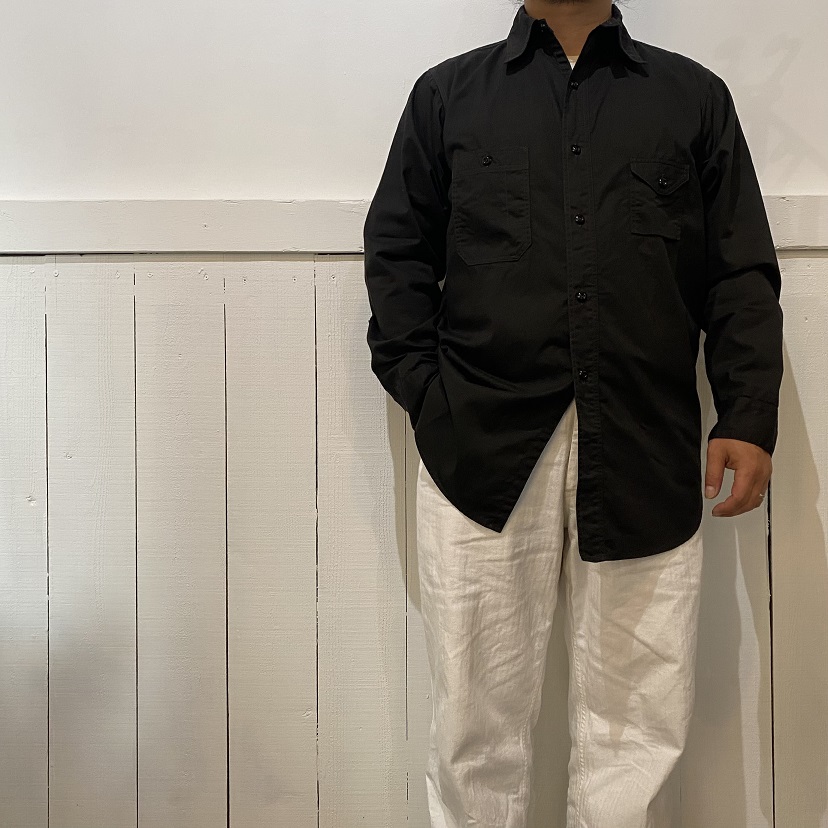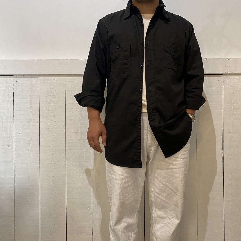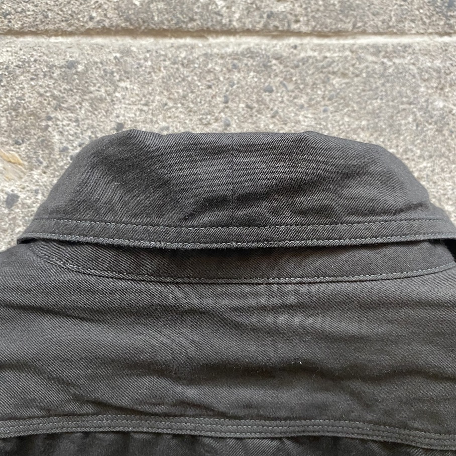 1920年代に作られたと推測される自身所有のビンテージワークシャツを参考にし、ネック部分には”チンストラップ”、胸部分には左右異なる大きさのポケットが付く所謂”変形ポケット”が付き、更には生地に”ブラックツイル生地”が使用されているワークシャツの中でもスペシャルなディティールを兼ね備えるシャツを当店のオリジナルアイテムとしてリリースいたします。