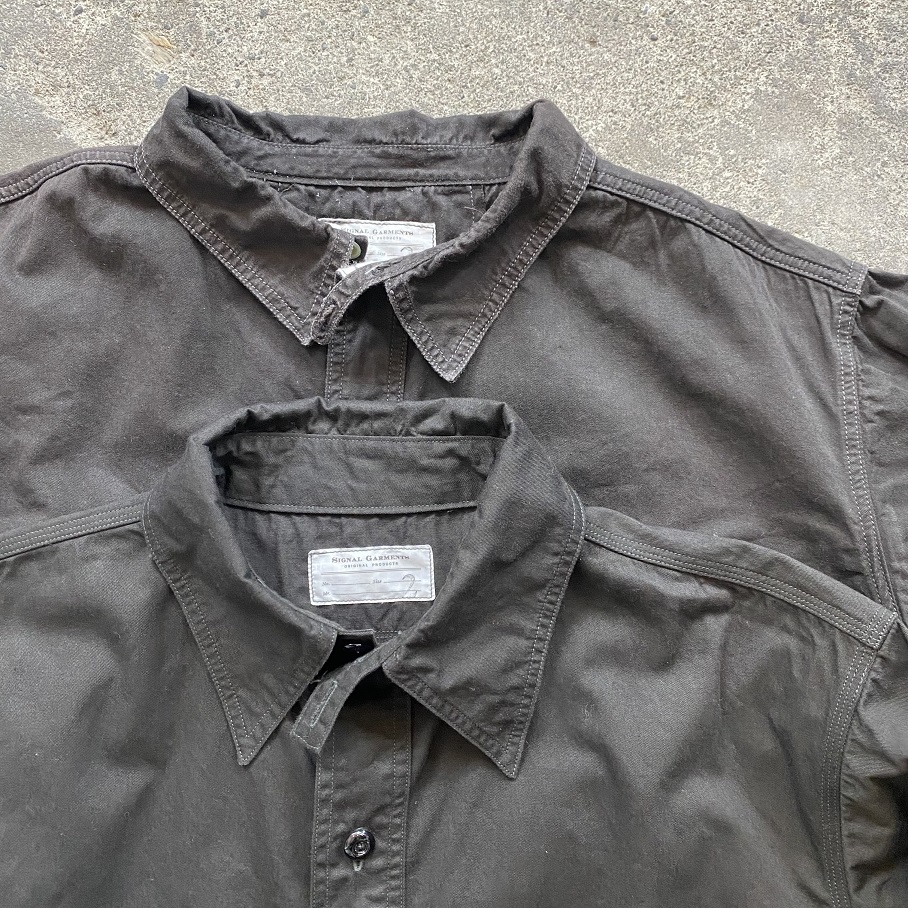 重ねて置いた下のシャツは同生地を使用して以前少量のみ生産をした別型のシャツとなります。(経年変化の参考にして頂ければと思います)