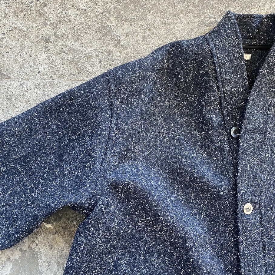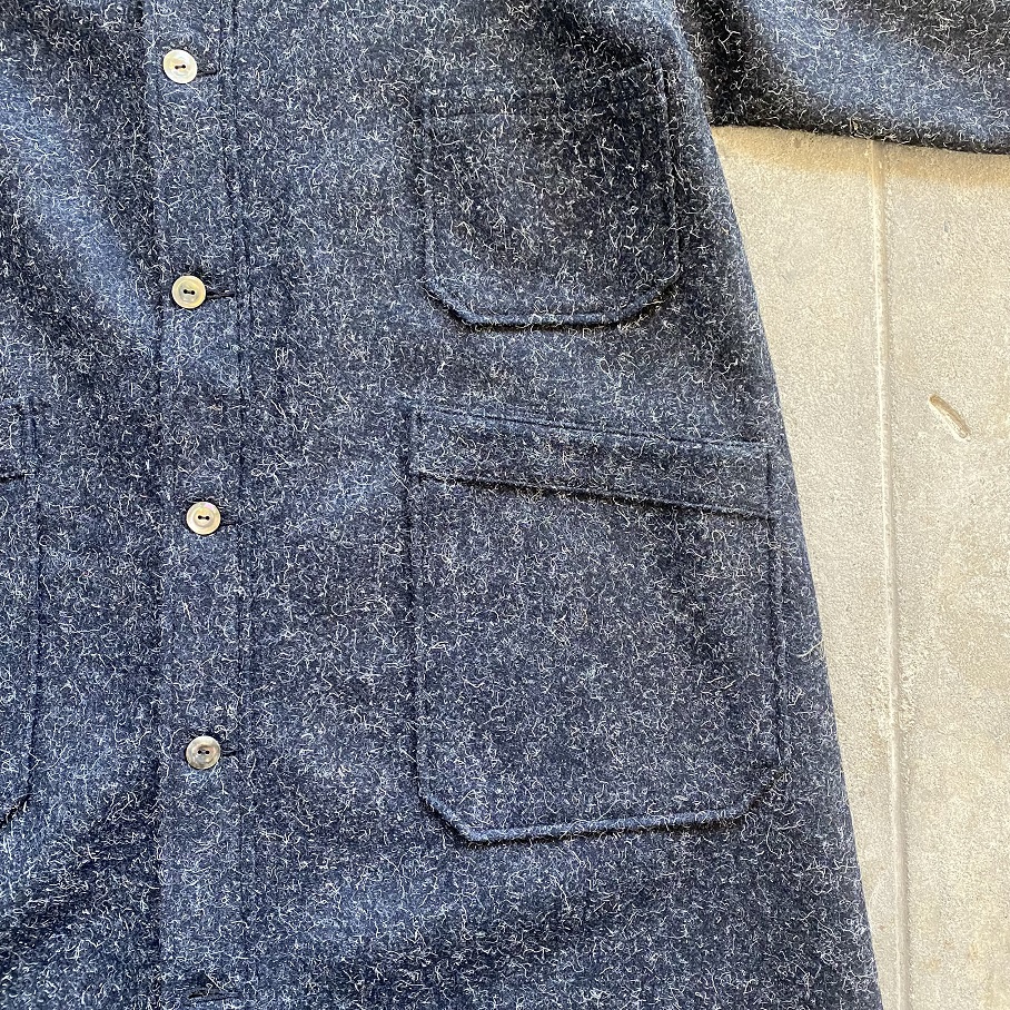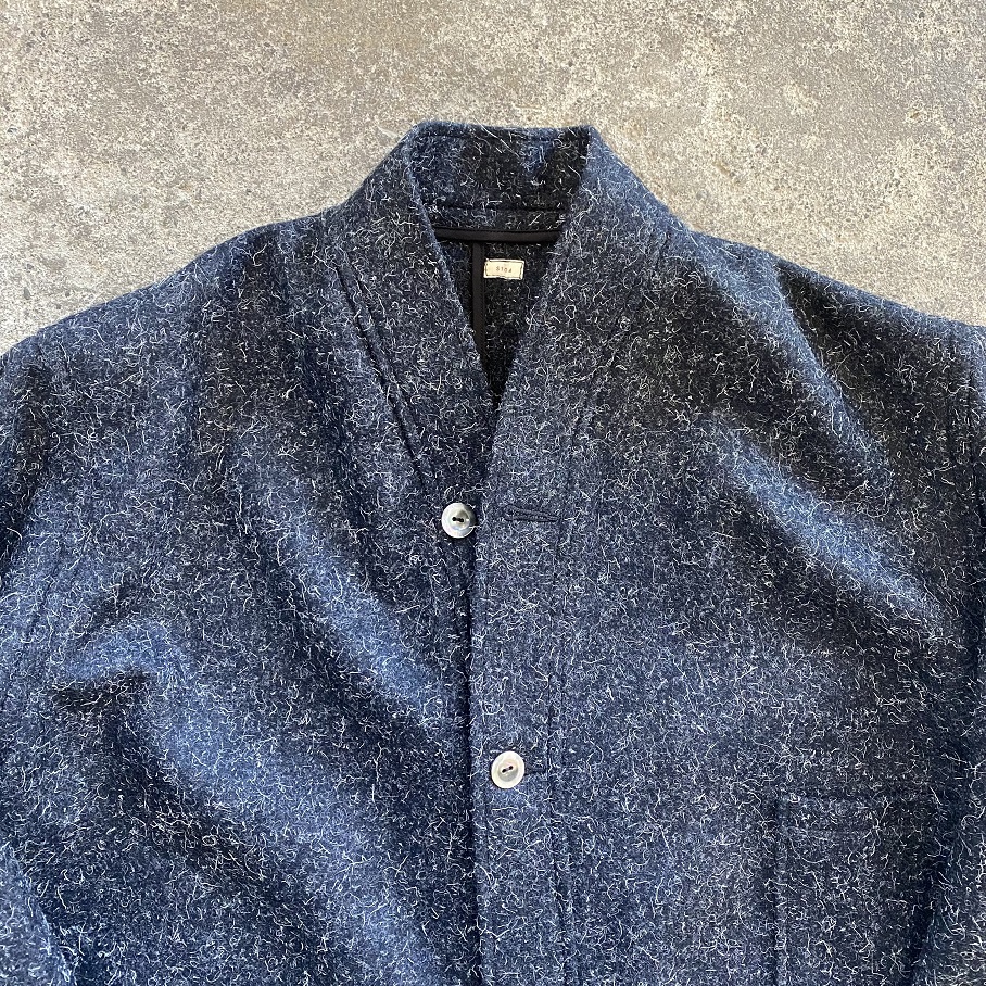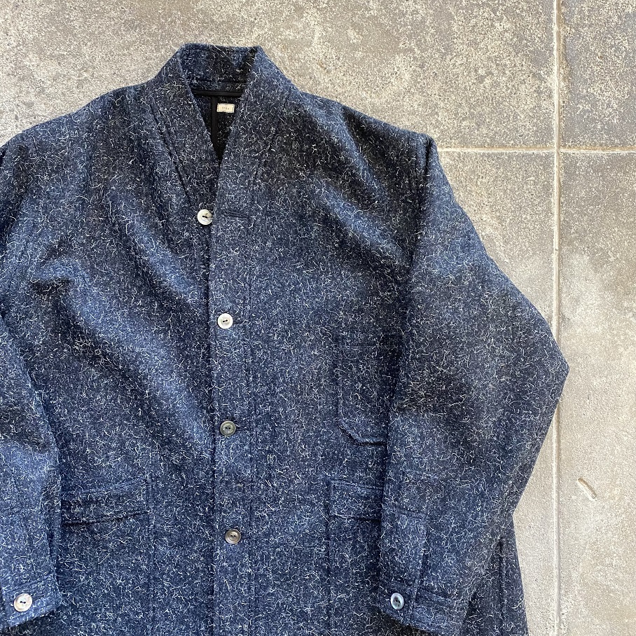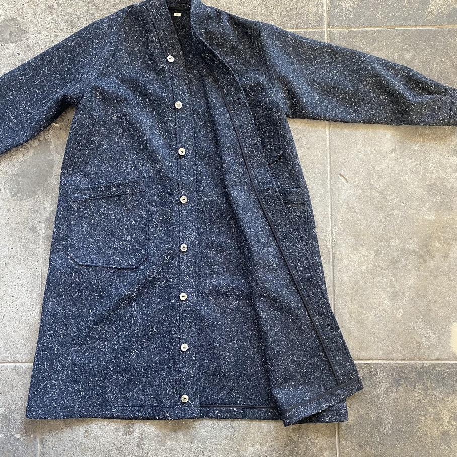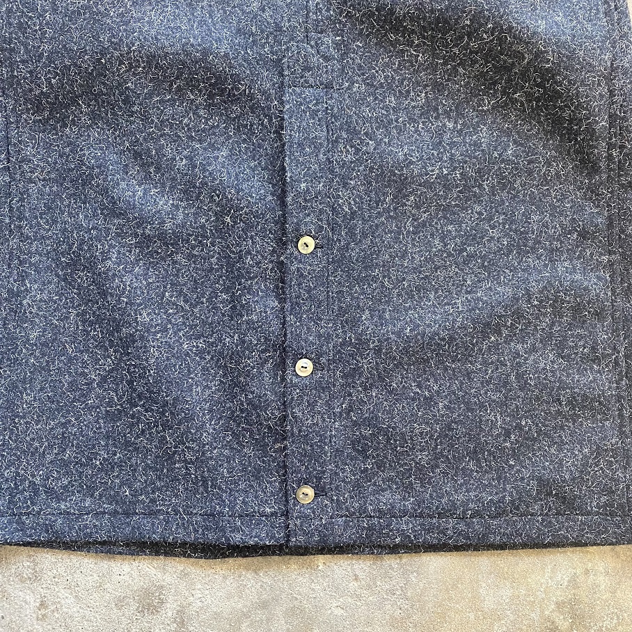 縮絨された厚すぎず、薄すぎないウールの生地感は、着初めは少し硬さを感じるかと思いますが、こちらのケンピウール生地は着込むほどに生地がほぐれ、柔らかさが出てくるのが特徴となりますので着ていくのが楽しみな一枚であると言えます。