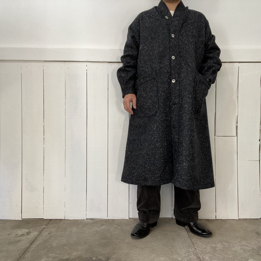 スタイル的には襟なしのロングコートスタイルですが参考としたエンジニアコート同様、アウターとしてはもちろん、薄手のロングコートのインナーとしての役割も果たす万能な一着です。