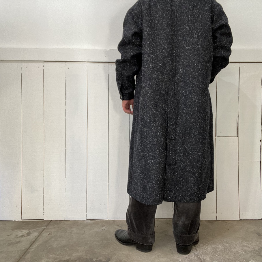 カラーは”NAVY BLUE”となります。太陽の自然光で見たときにはうっすらとNAVYが浮き上がり、室内などではほぼグレー~ブラックのように見える点も他のコートではなかなか無い色目かと思います。