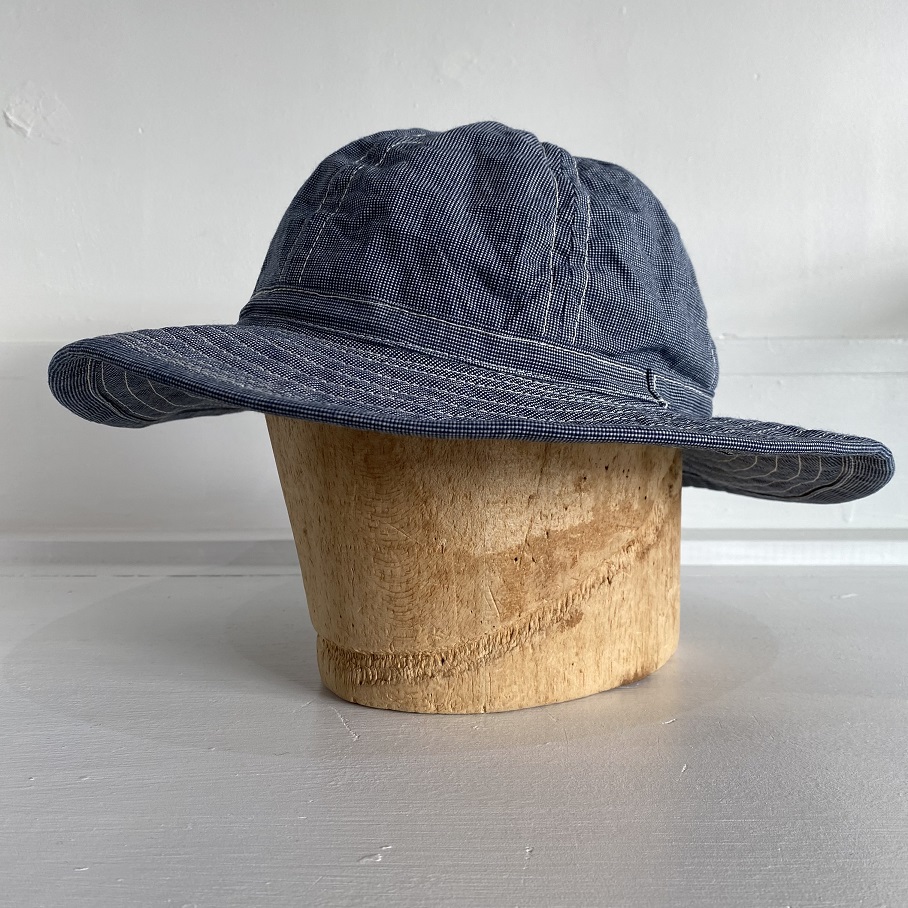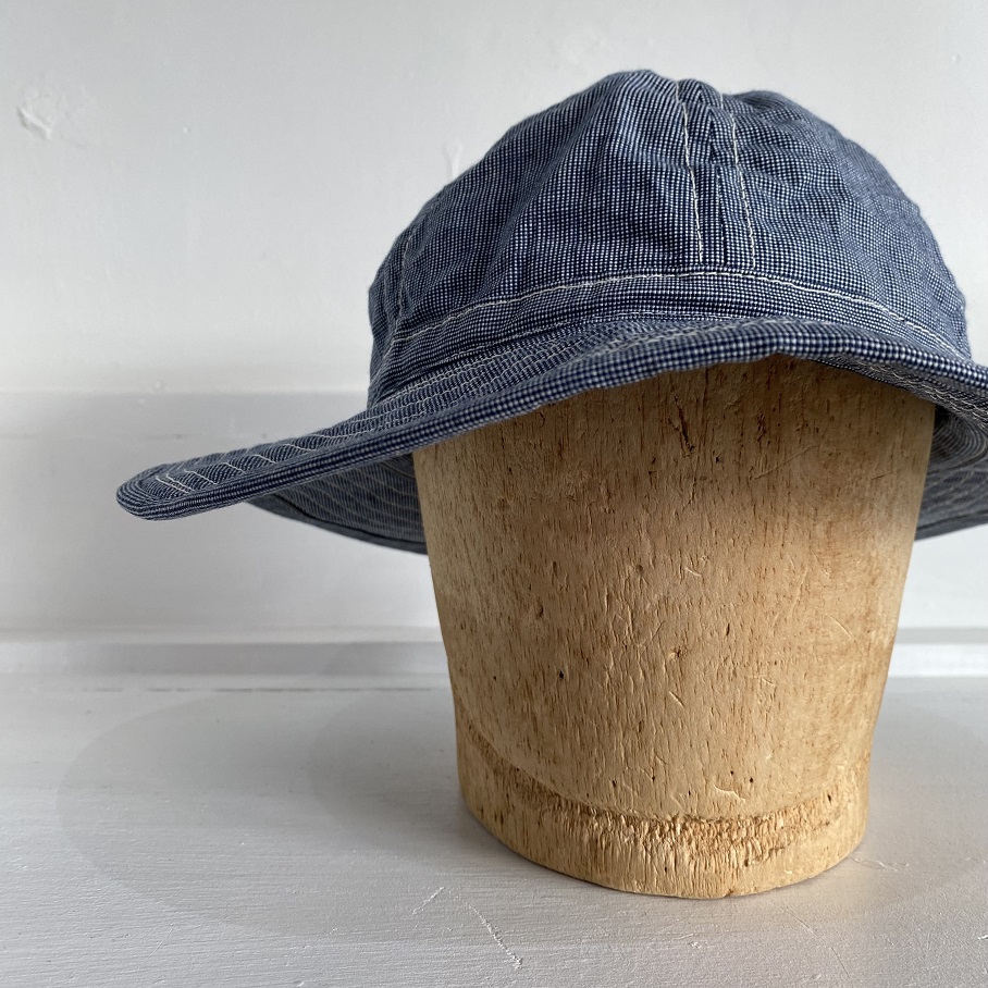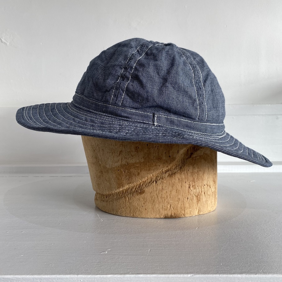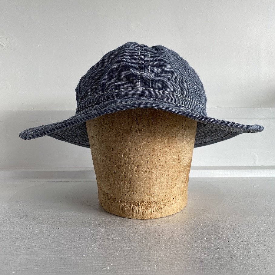 生地は新材となりますがオールドスタイルのワークアイテムでも極稀に見かけるインディゴブルーピンチェック生地を使用しております。ワークキャップでは見かけてもフルブリムのハットでは見かけない物ですが非常にバランスの良い物に仕上がったと思います。