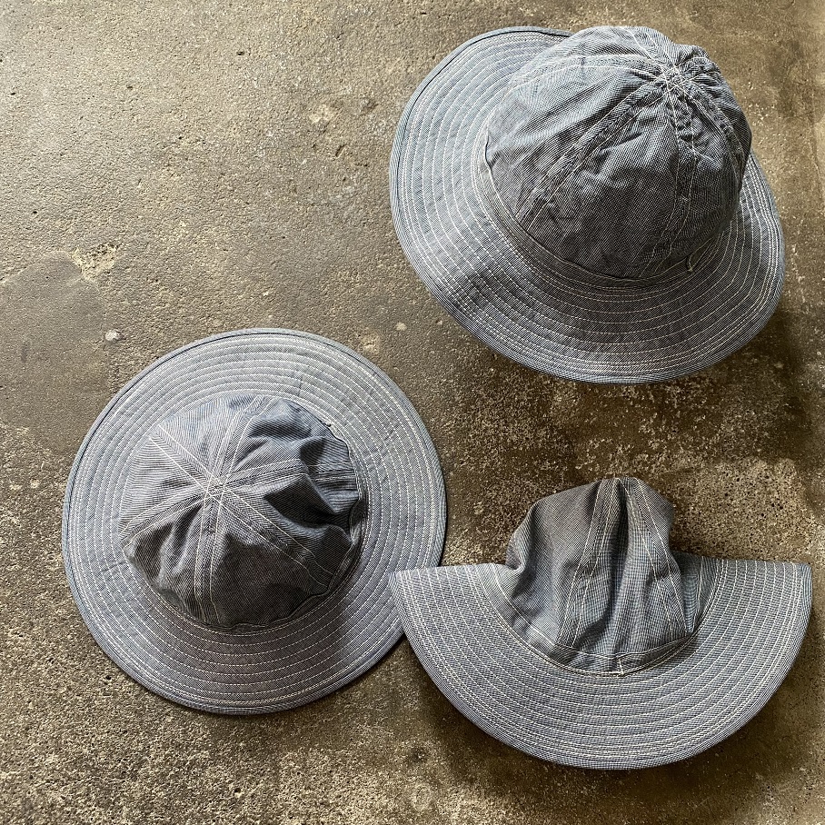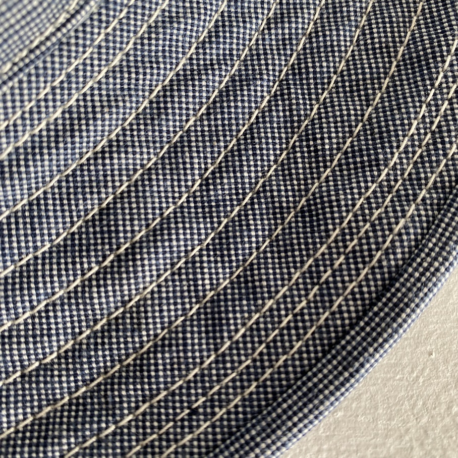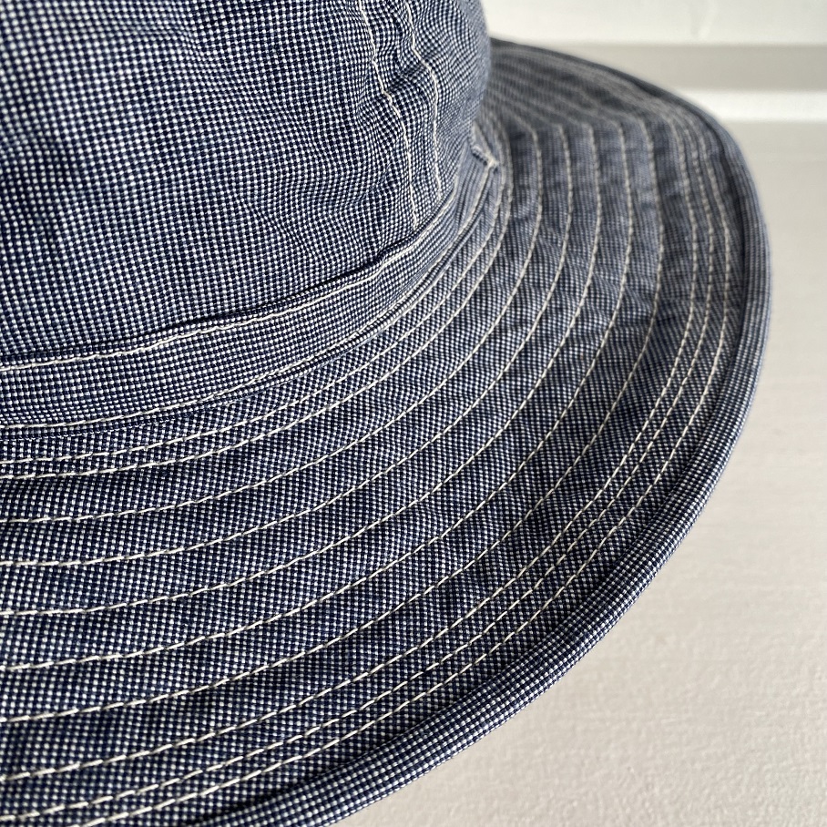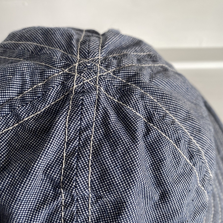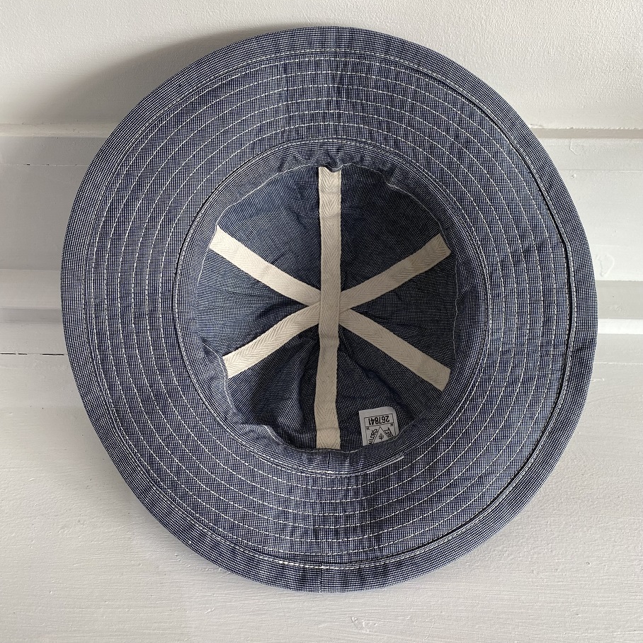 生地は新材となりますがオールドスタイルのワークアイテムでも極稀に見かけるインディゴブルーピンチェック生地を使用しております。ワークキャップでは見かけてもフルブリムのハットでは見かけない物ですが非常にバランスの良い物に仕上がったと思います。