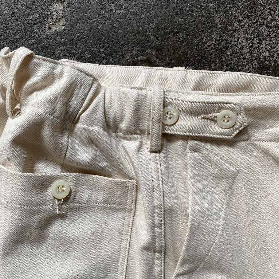 フロント、サイドのボタンにはシェルボタンが使用されており、ノーベルトで着用した時のウエスト廻りの質感も損ないません。