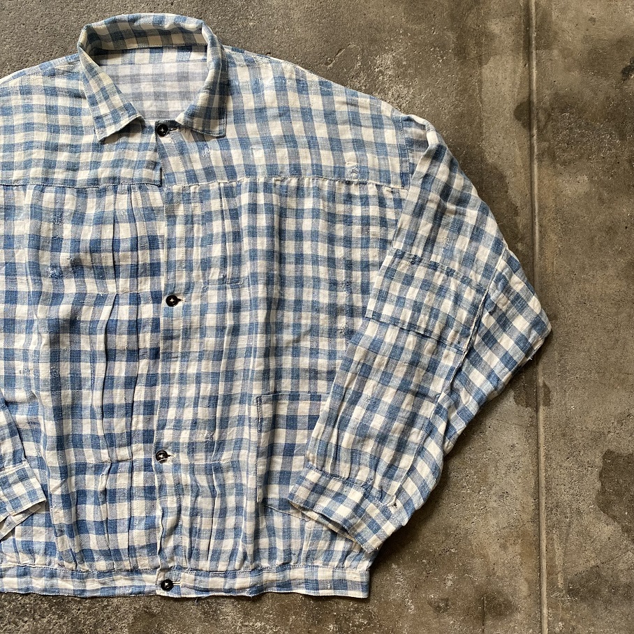 こちらは今回参考としたブルーチェックジャケット。生地はおそらく100年近く経っている為、沢山の補修を施しております。