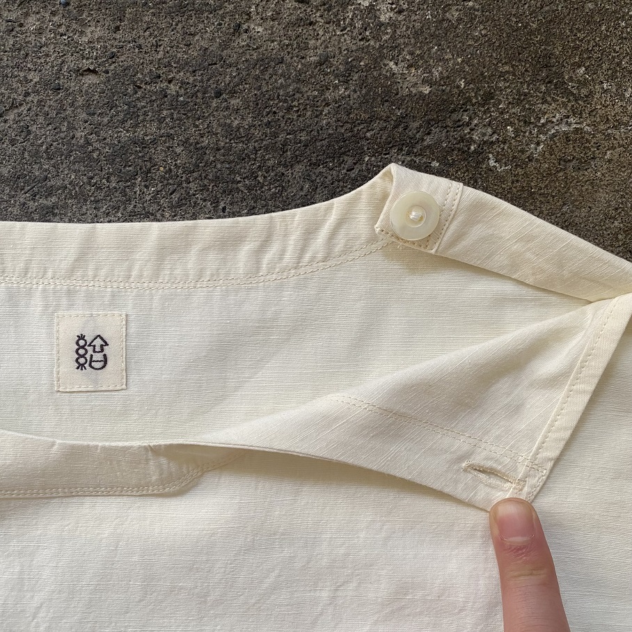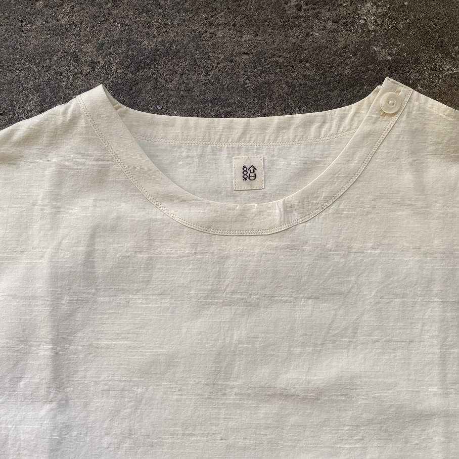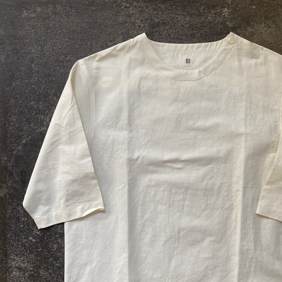 ネックサイド部分に一つだけ付くボタンにて着用することが出来、ディティールはポケットなども付かない非常にシンプルな物となりますが、着用した時の存在感はTシャツでもなく、襟付きのシャツでもない唯一無二の物となります。