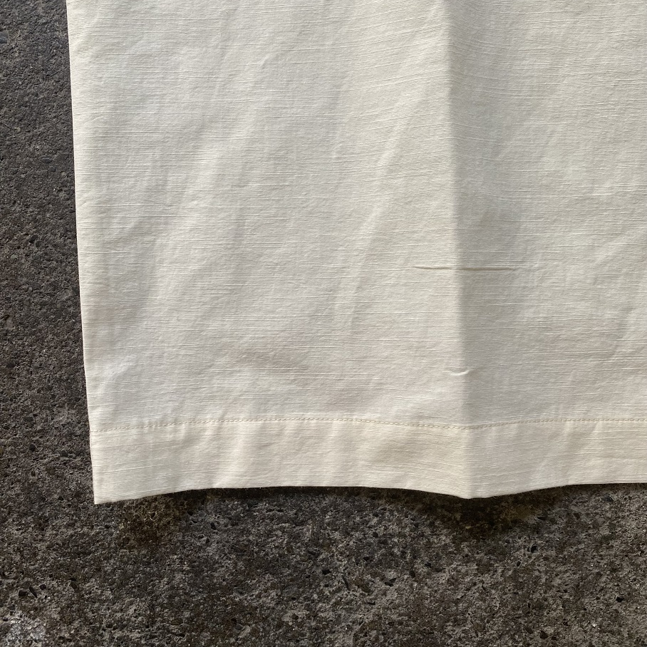 緯糸に表情豊かなコットンリネンのスラブヤーンを打ち込み、更に丹念な揉み込み加工を施すことによってビンテージのようなシボ感とドライな風合いを表現しております。