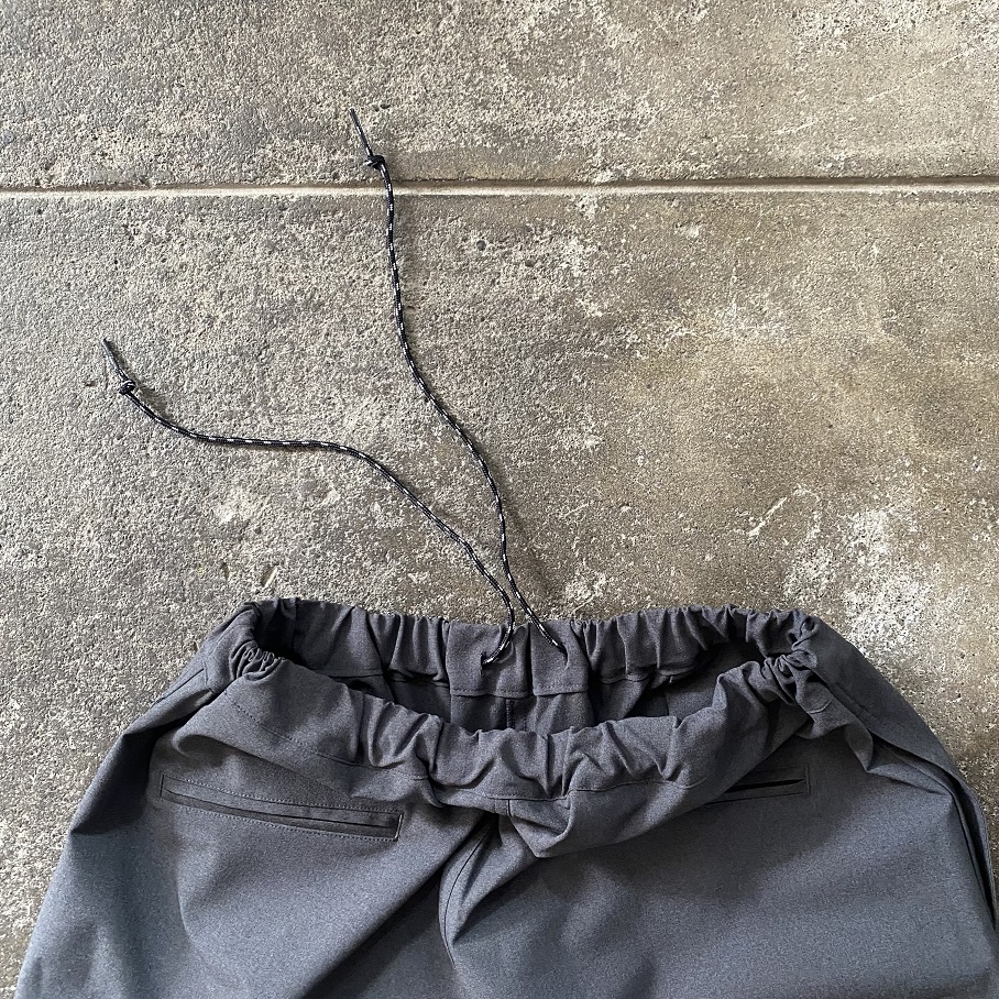”イージーパンツ”なので当然ウエストはコードとウエストゴム仕様なのですが、しっかりとした両玉縁ポケットが左右に付いていることでカチッとした印象となり、カジュアル過ぎない印象です。