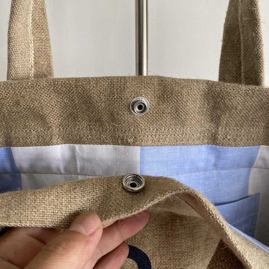トップ部分にスナップボタンが付いており、オープントップ型のトートバッグながら口を閉じることが出来ます。