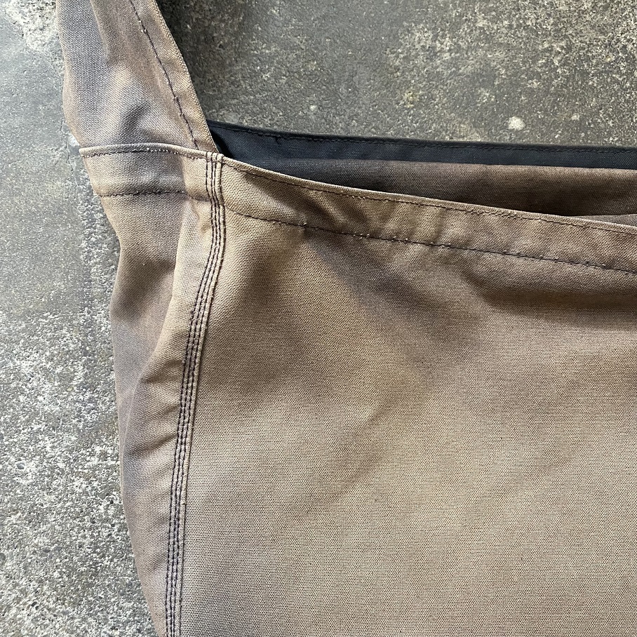 太陽の光をたっぷりと浴びて使い込まれたニュースペーパーバッグはブラックからブラウンのように変化をしております。