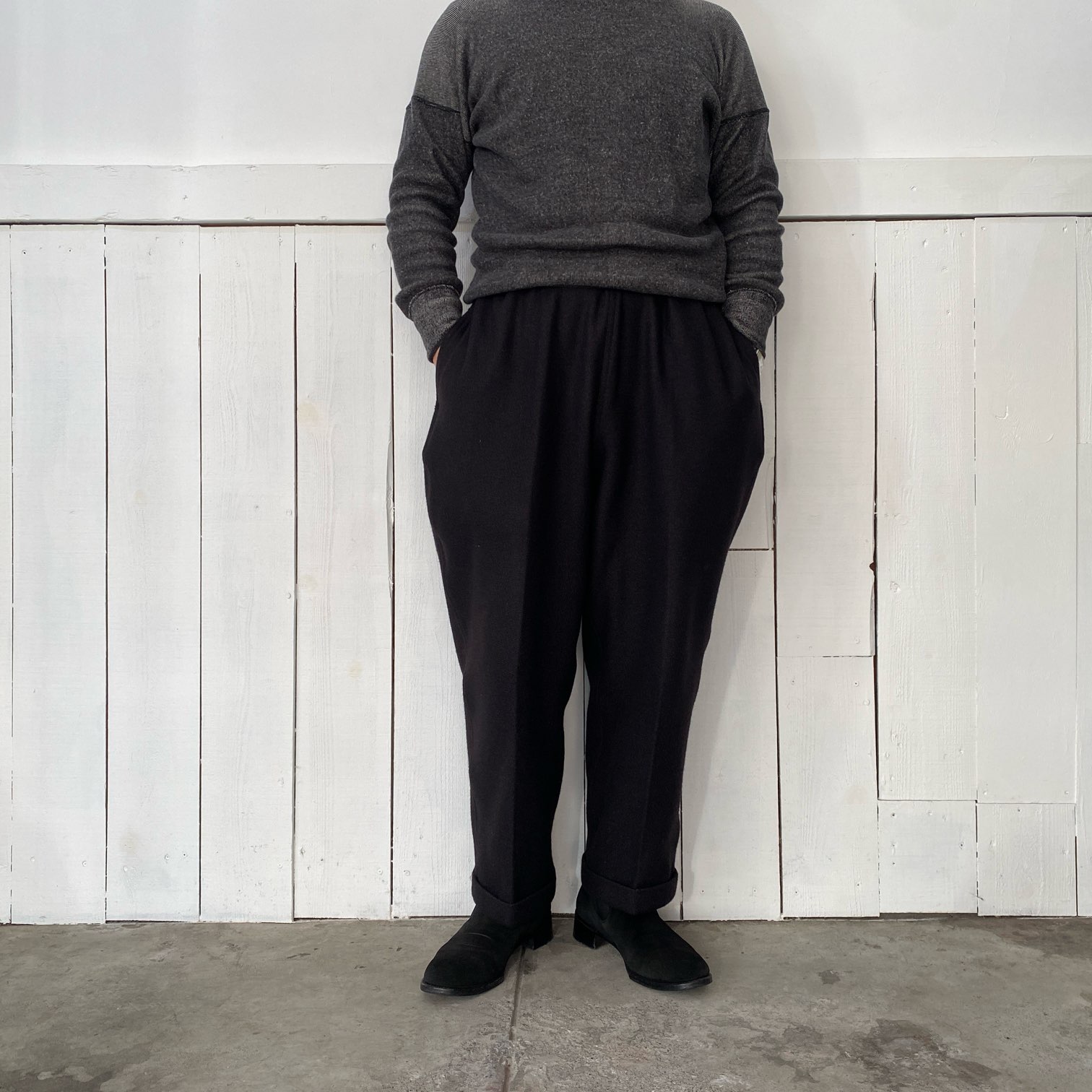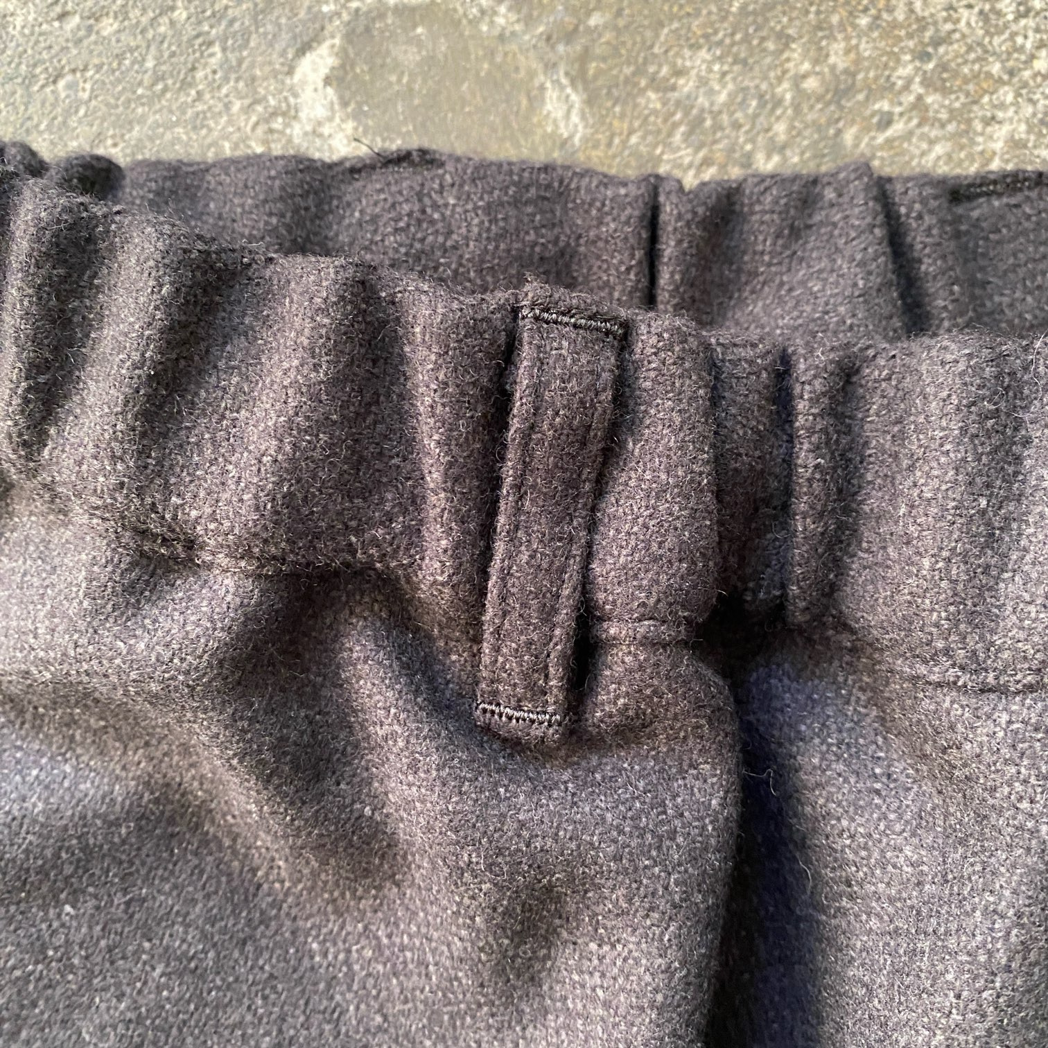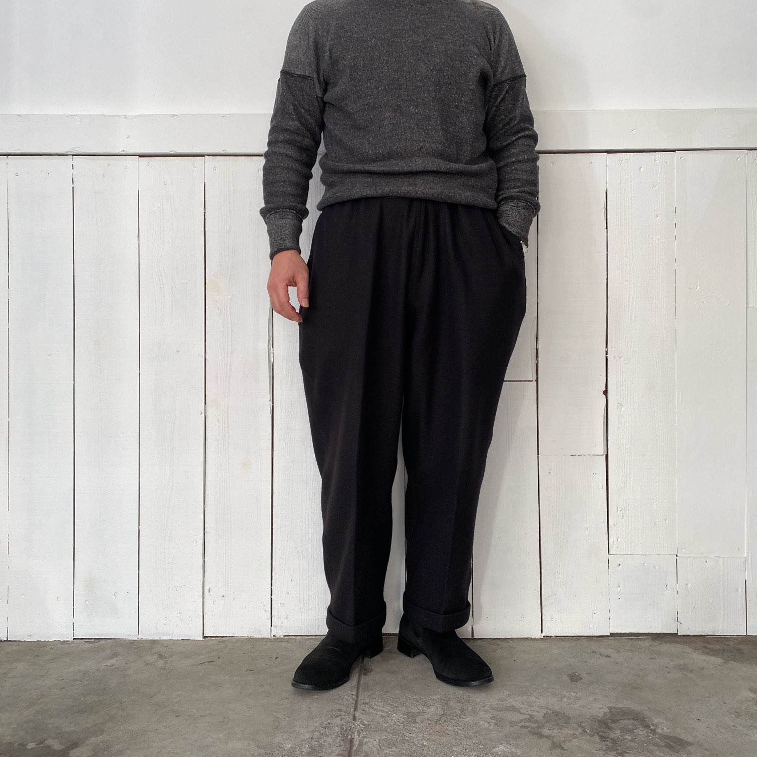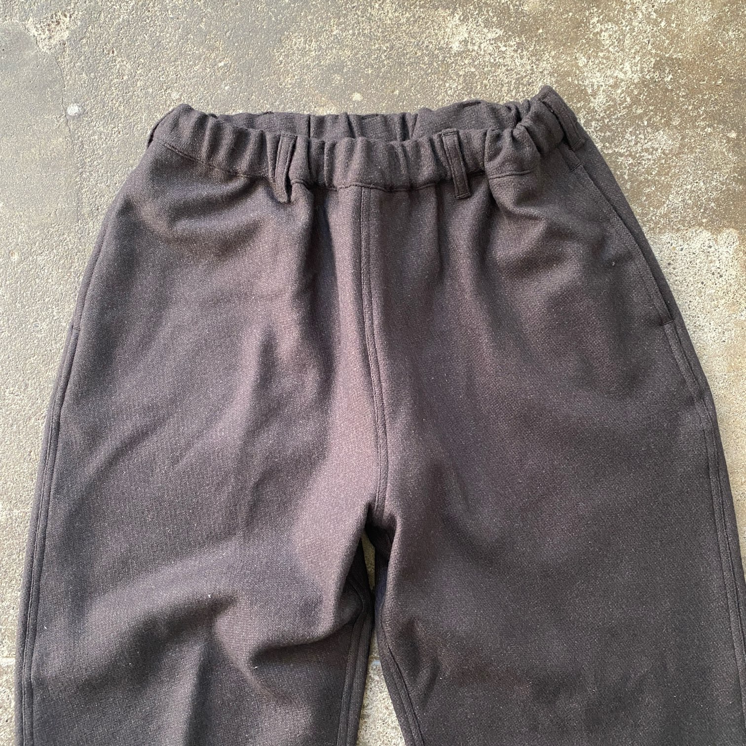 ”質感の良いウール素材でシルエットの良いパウダーホーンのイージーパンツが穿きたい”という目標を掲げ、素材選定から打ち合わせをさせていただき、ウール80%・シルク20%という非常に肌触りの良いウール生地にたどり着きました。