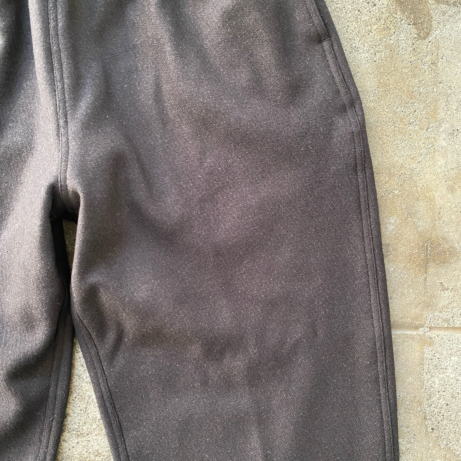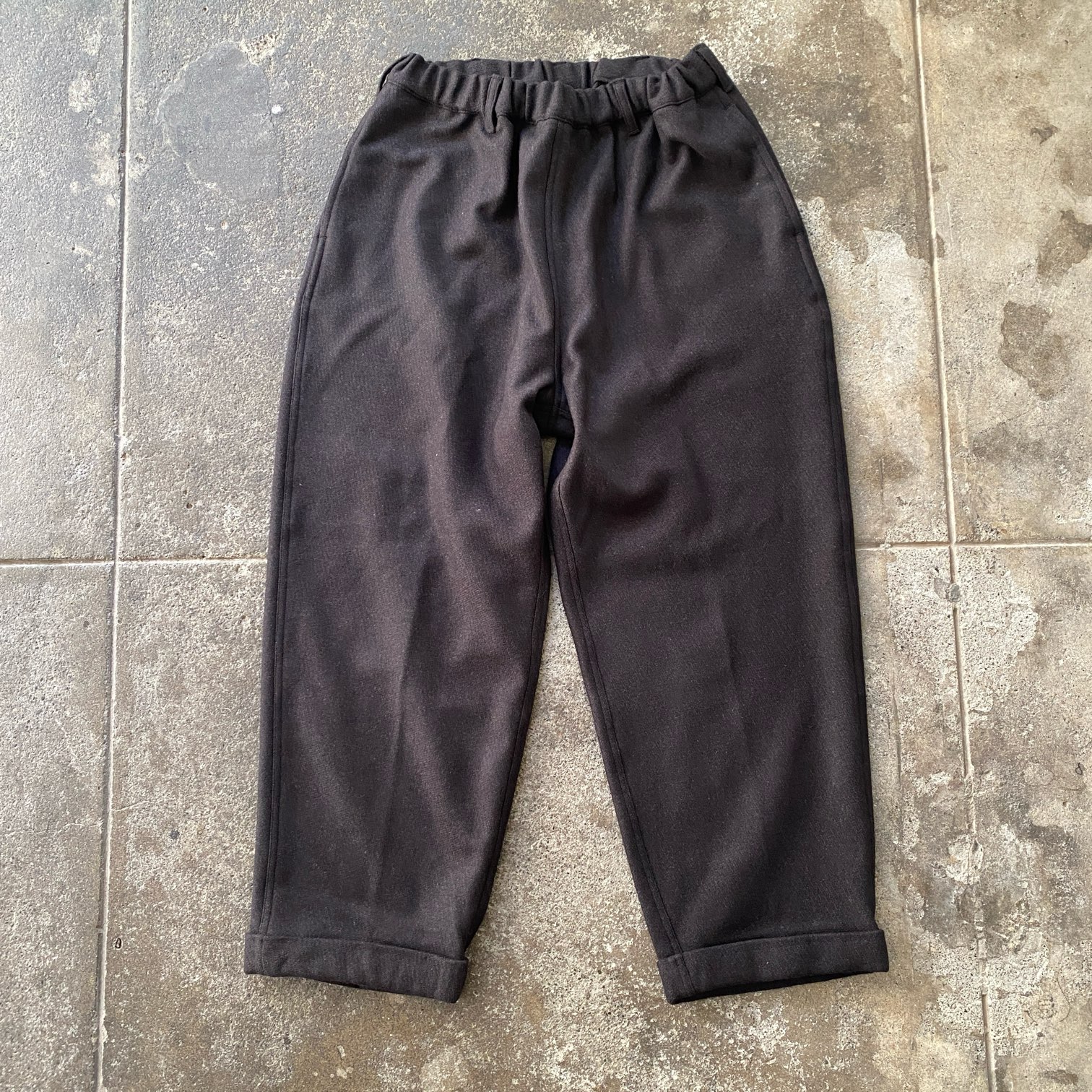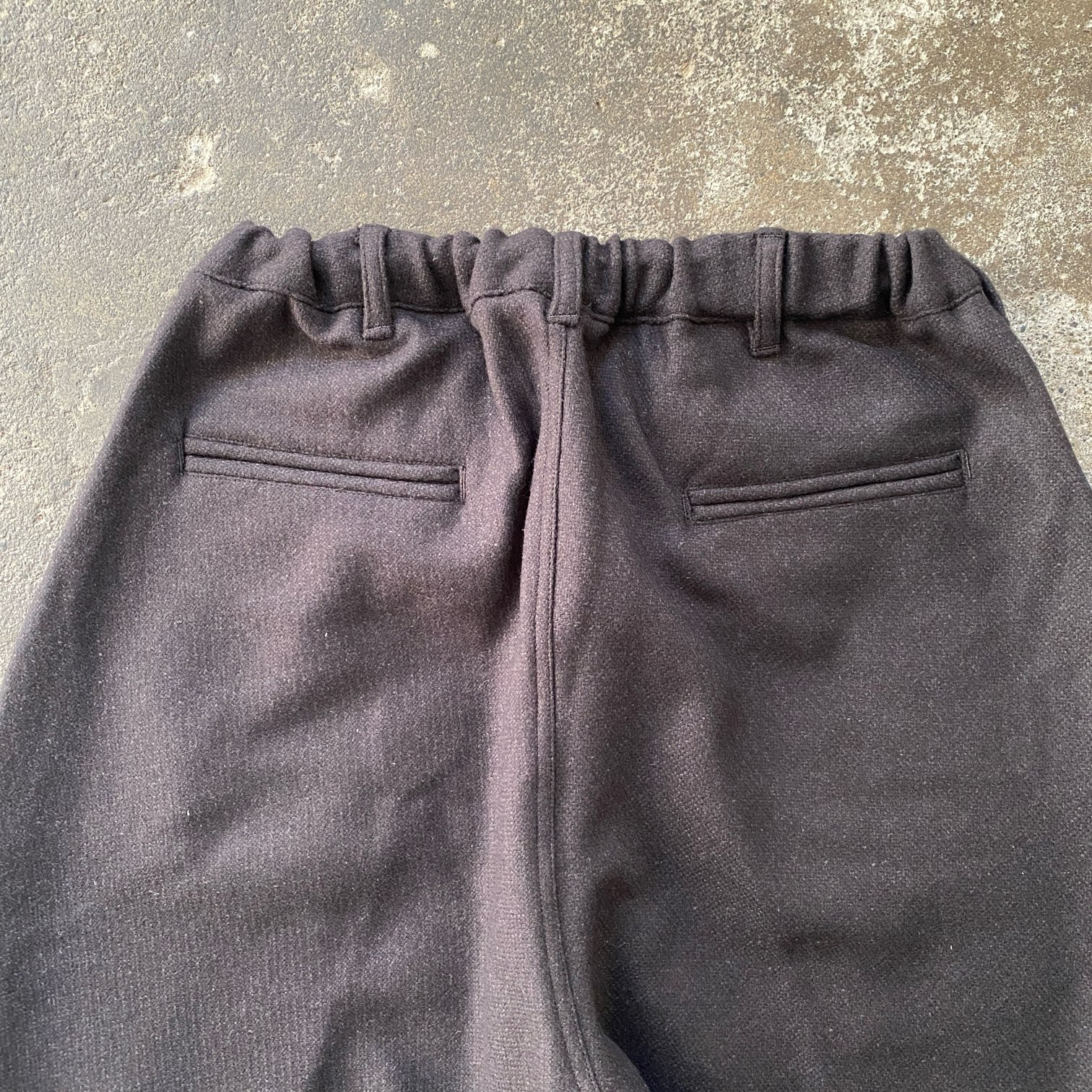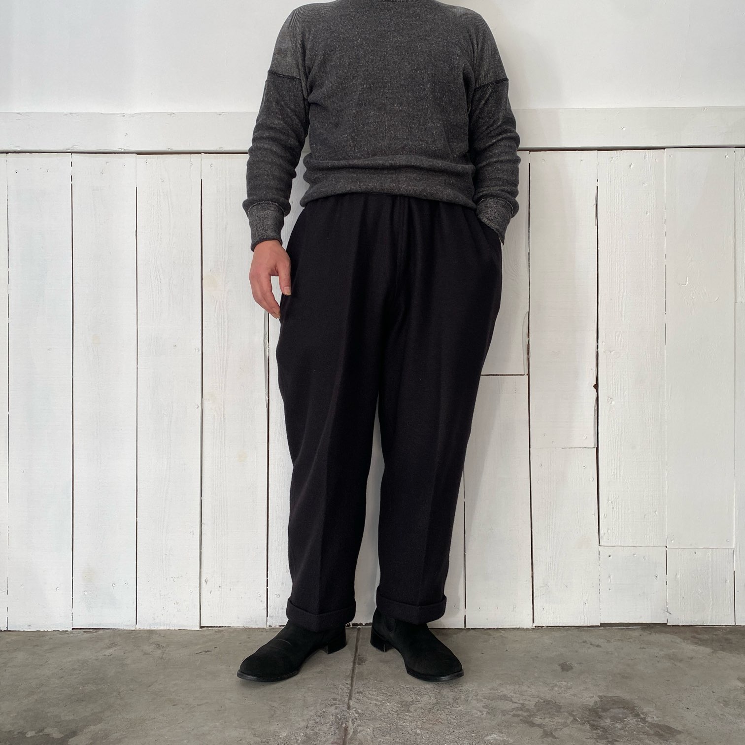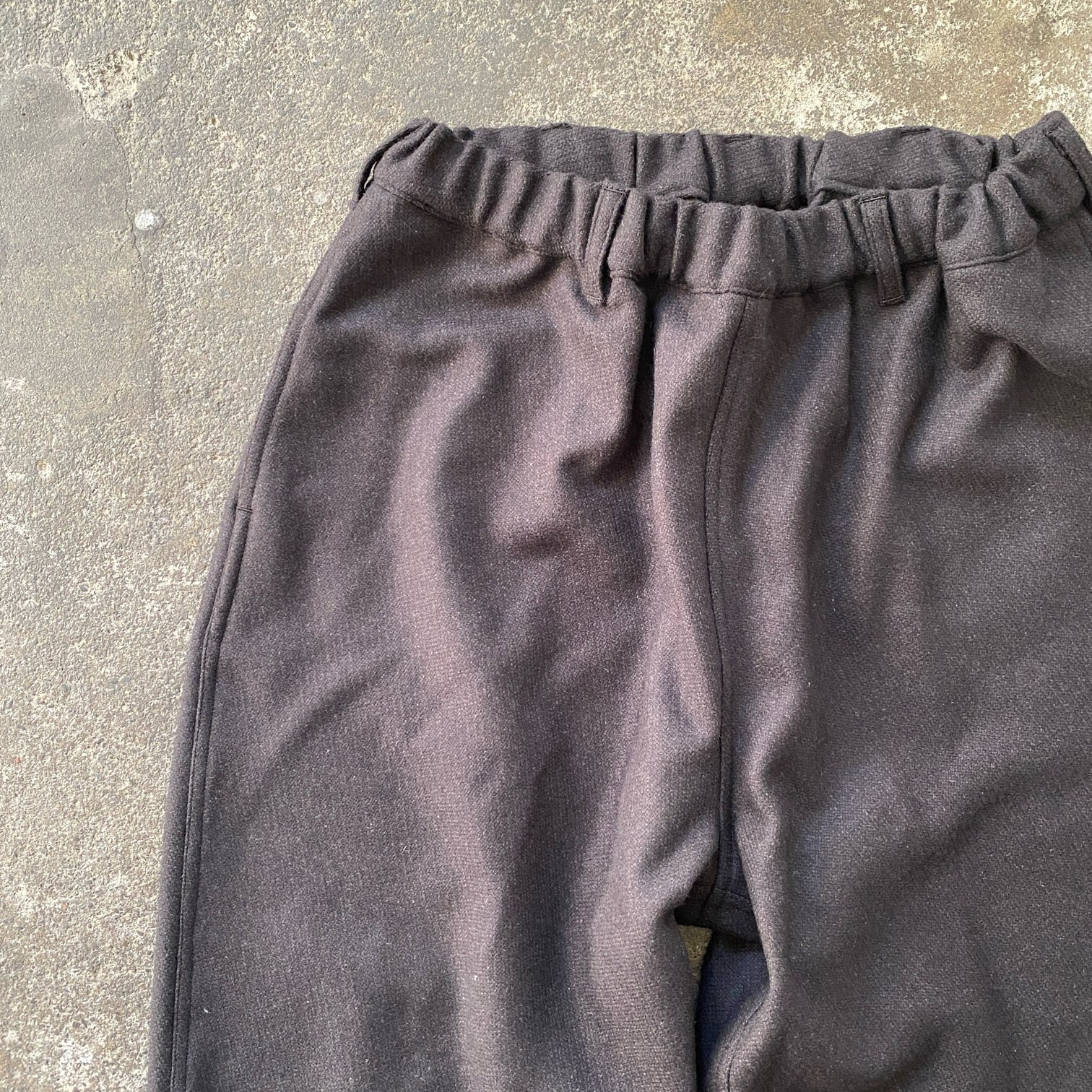 ”質感の良いウール素材でシルエットの良いパウダーホーンのイージーパンツが穿きたい”という目標を掲げ、素材選定から打ち合わせをさせていただき、ウール80%・シルク20%という非常に肌触りの良いウール生地にたどり着きました。