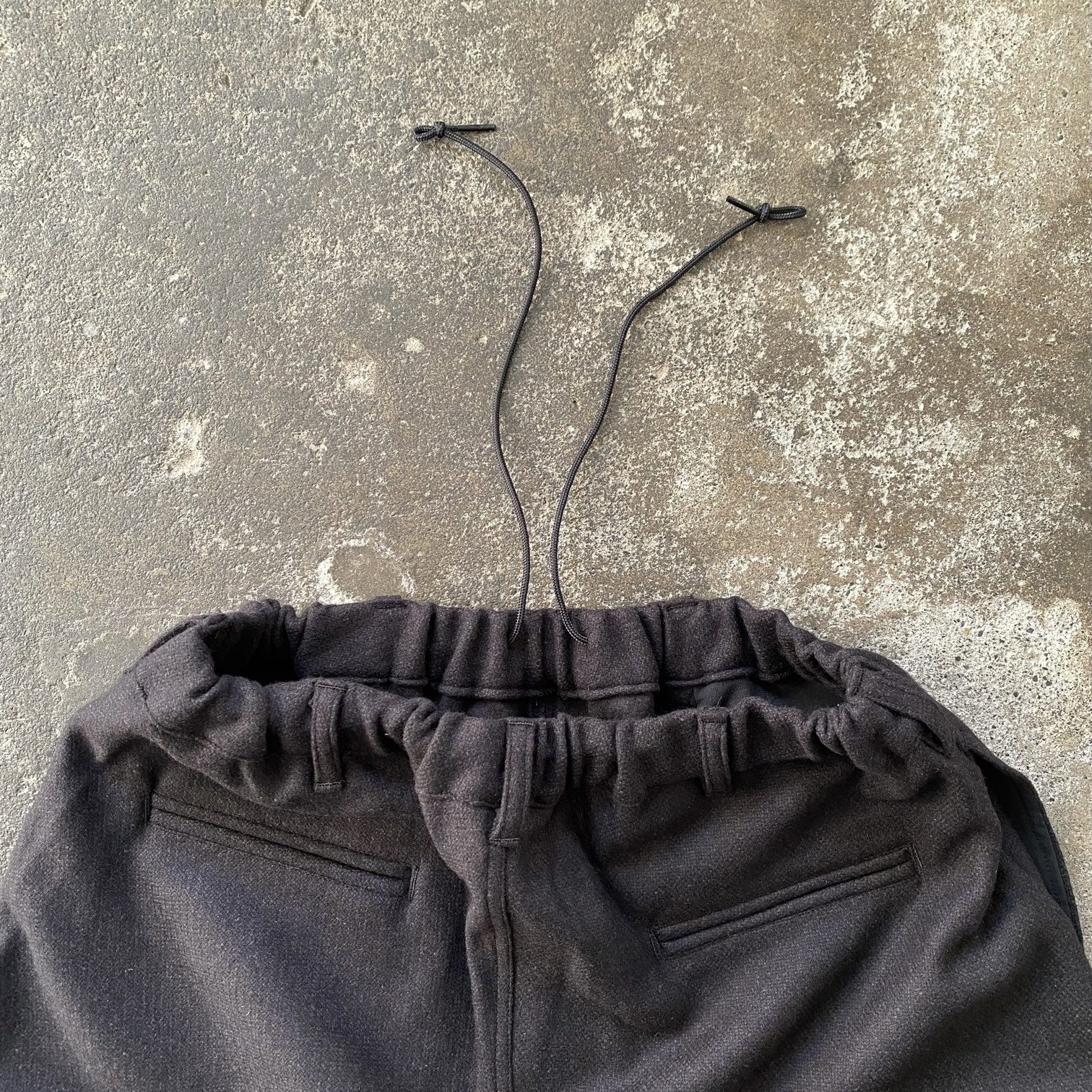 ”イージーパンツ”なので当然ウエストはコードとウエストゴム仕様なのですが、しっかりとした両玉縁ポケットが左右に付いていることでカチッとした印象となり、カジュアル過ぎない印象です。